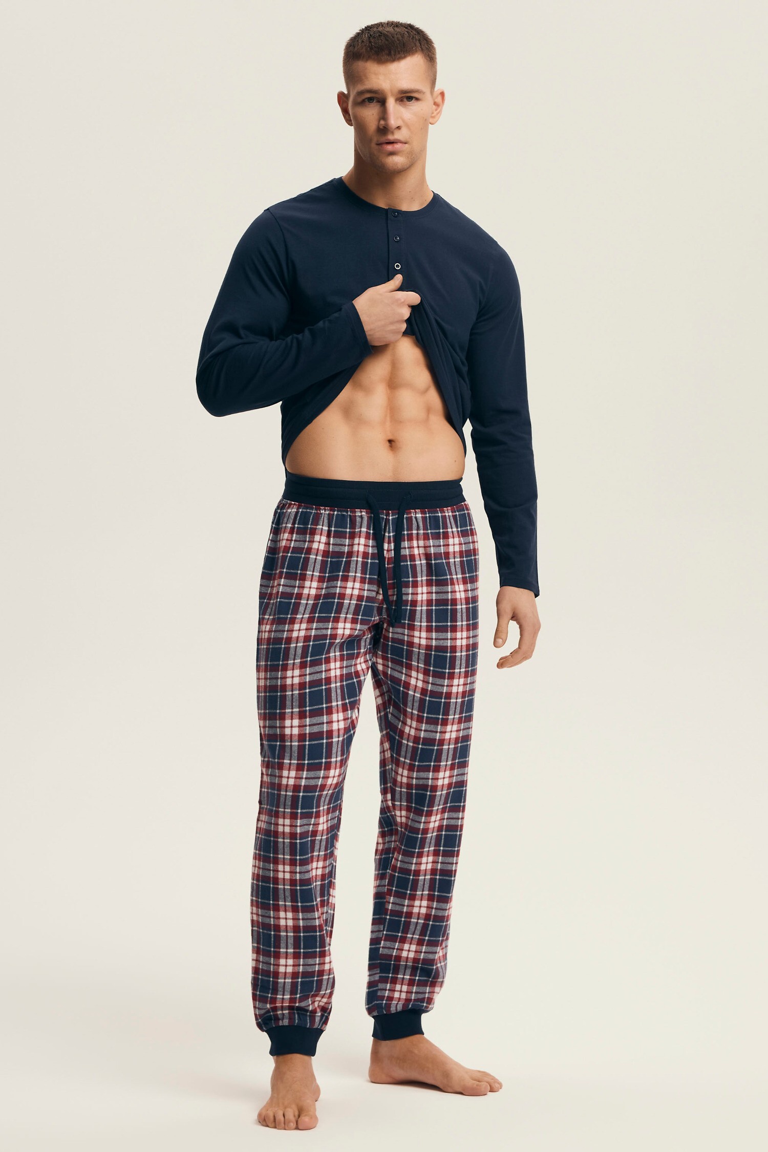 Pánské bavlněné pyžamo - košile s dlouhým rukávem - kulatý výstřih s knoflíky - dlouhé, volné kostkované kalhoty - žebrované manžety a pas - stahovací šňůrka v pase pro nastavení Složení: 100% bavlna