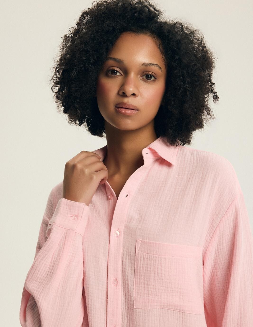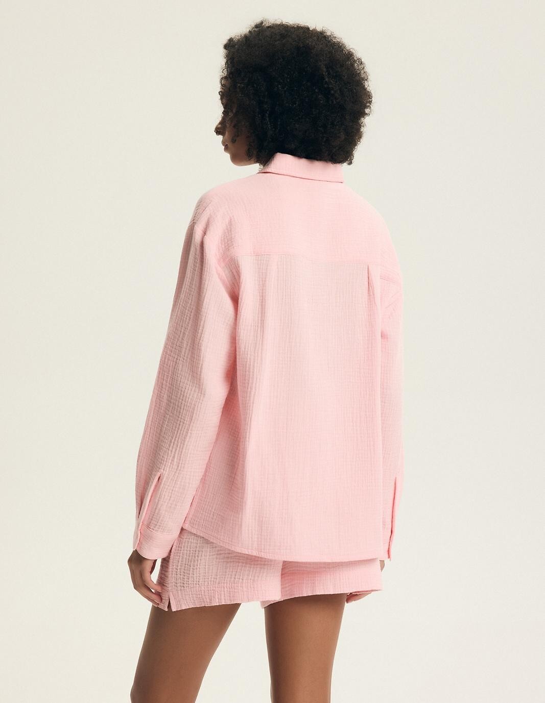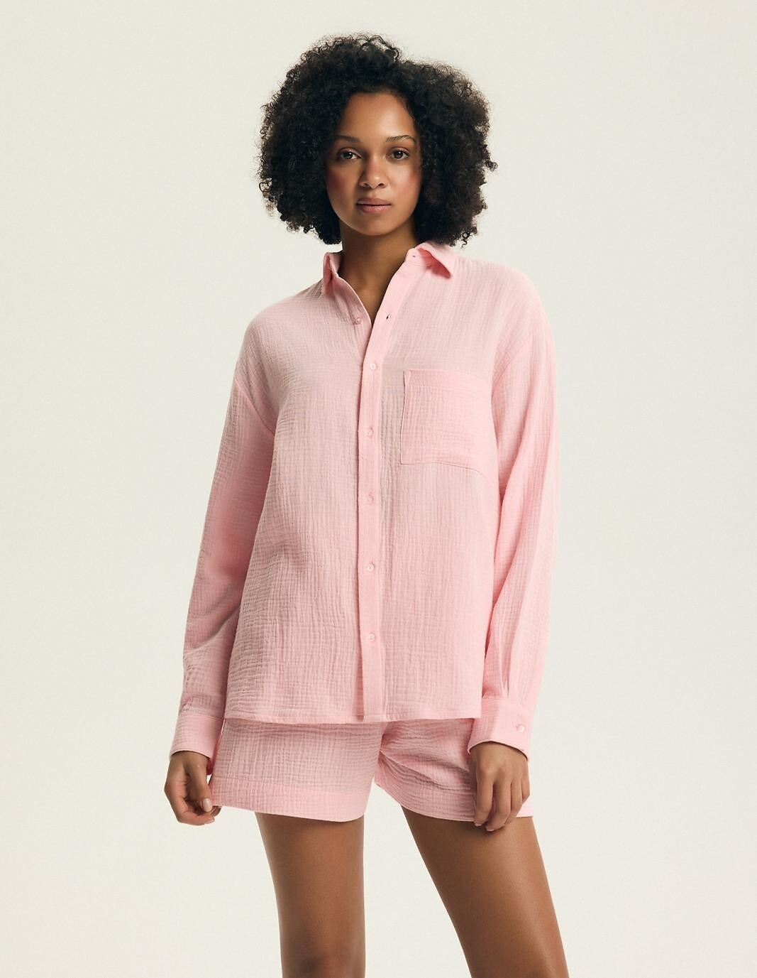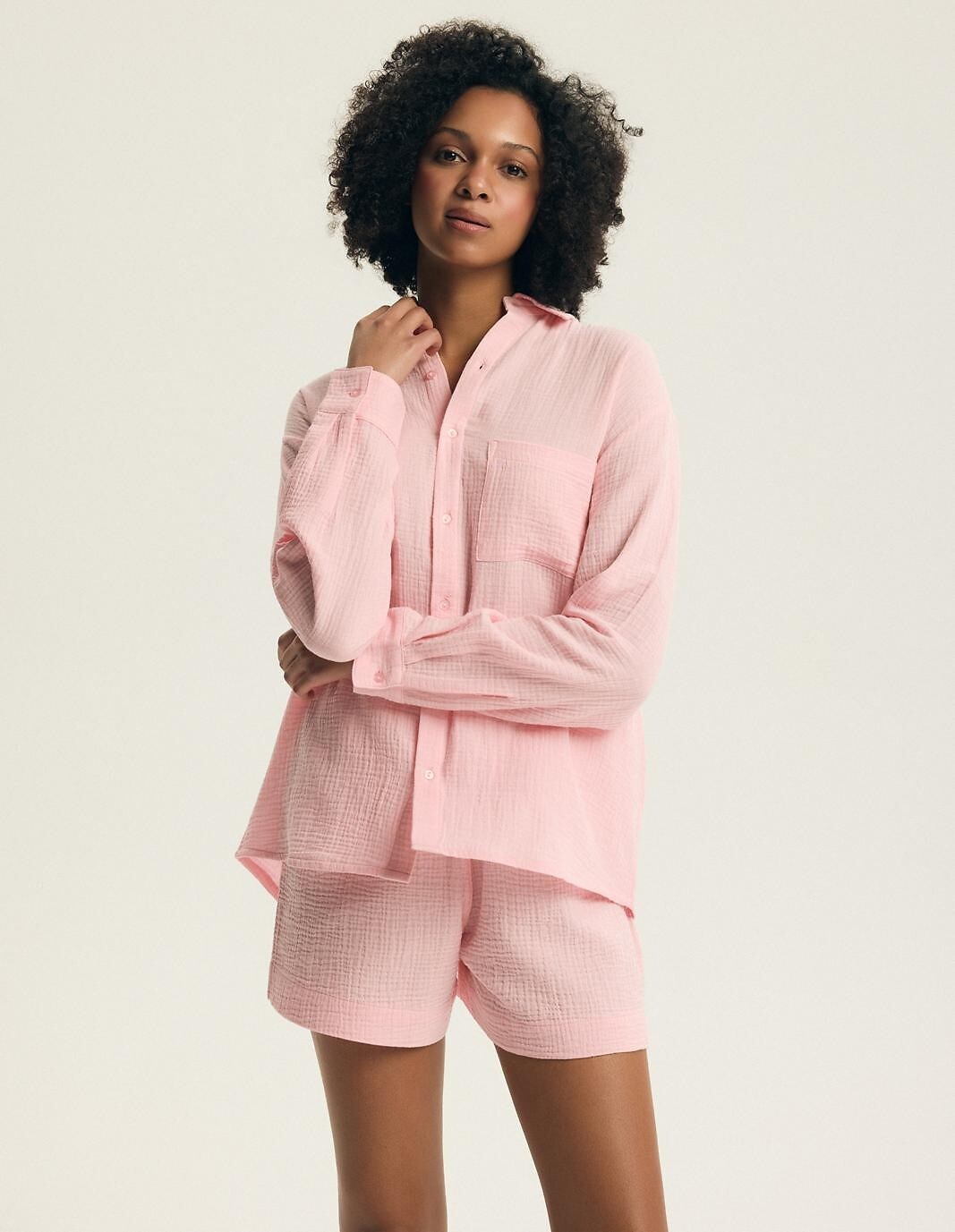Dámský letní pyžamový set - lehký, vzdušný materiál (mušelín) - volný, ležérní střih - košile s límečkem, zapínání na knoflíky - dlouhé rukávy, manžety na knoflíky - kraťasy - pohodlný elastický pas Složení: 100% bavlna