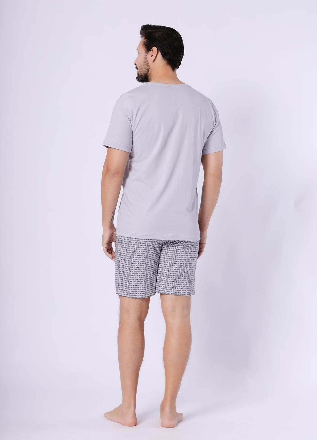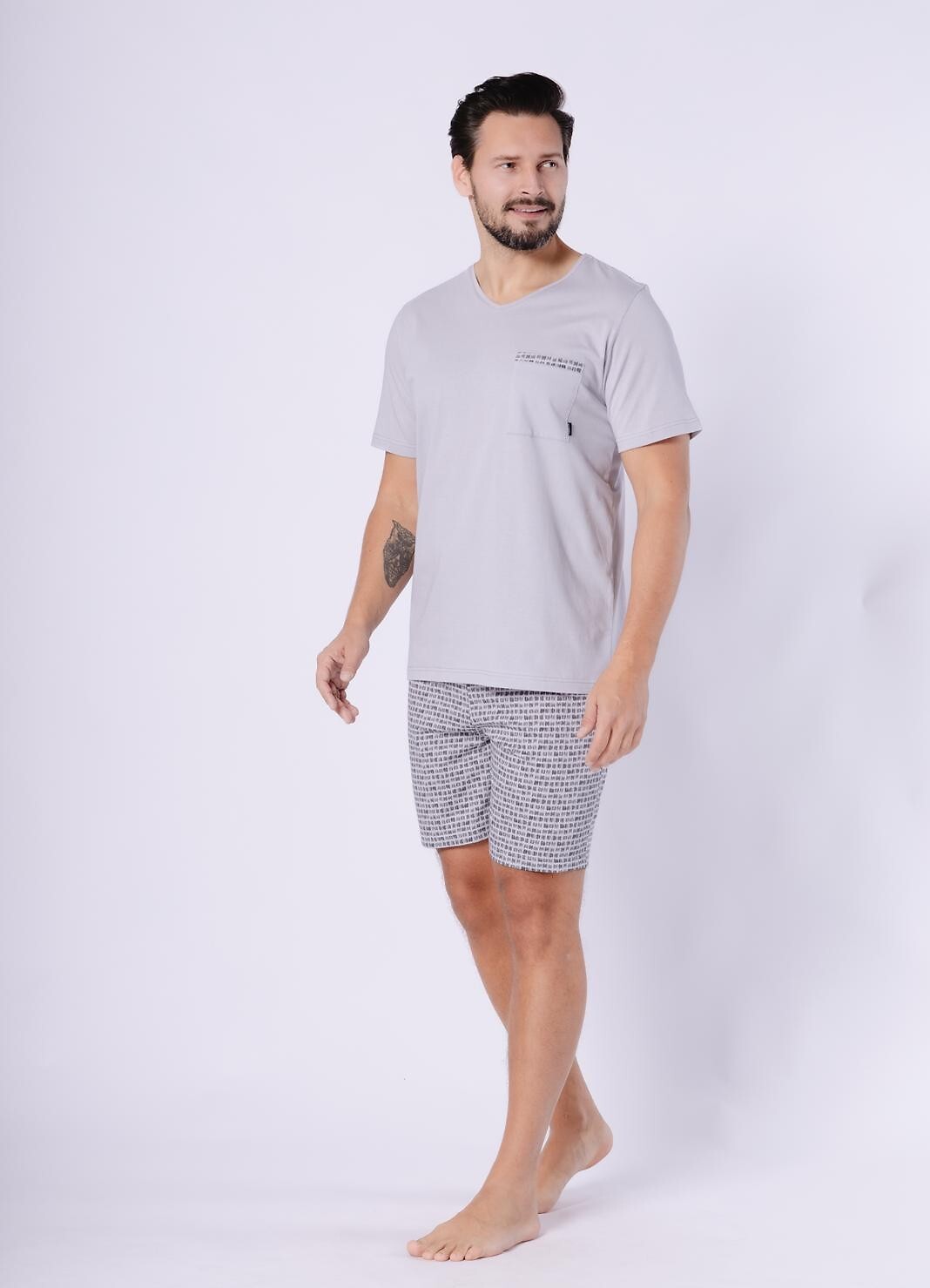Pánské bavlněné pyžamo - jednobarevné tričko s krátkým rukávem - výstřih do V - nakládaná kapsa na hrudi - krátké vzorované kraťasy - elastický pas s bavlněným lemem Složení: 100% bavlna