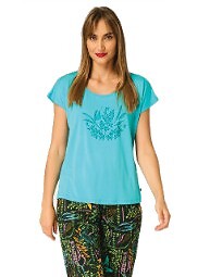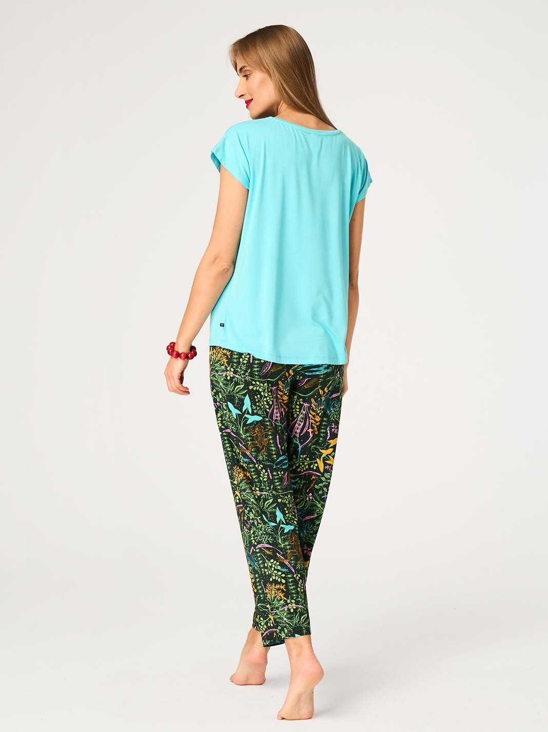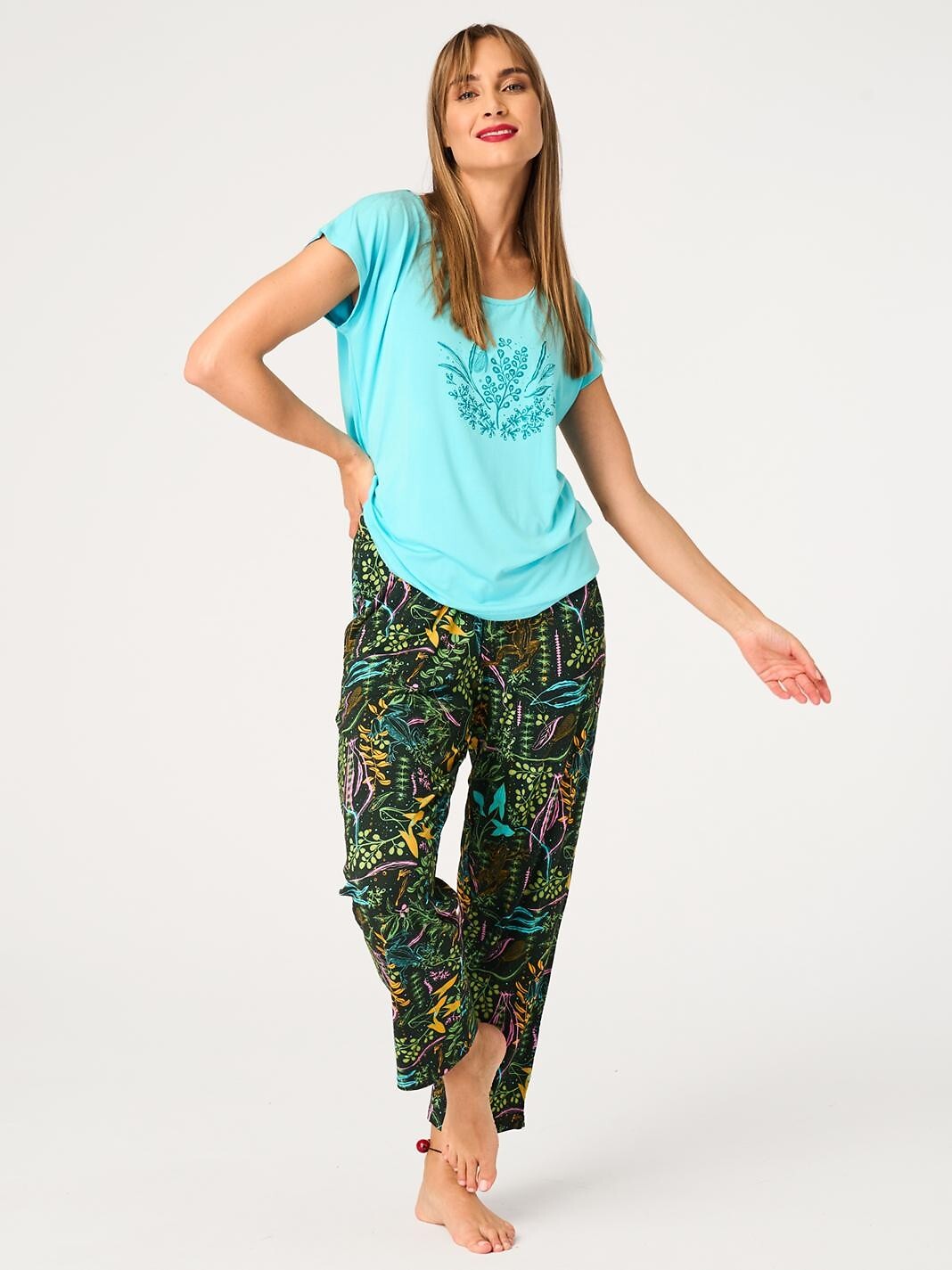 Dámské pyžamo - vysoce kvalitní viskóza - tričko s krátkým rukávem - půlkulatý výstřih - přední část zdobená jemným rostlinným potiskem - barevné kalhoty v délce 7/8, které ladí s kalhotami - pohodlné kapsy - bavlněný lem v pase - baleno v plastovém sáčku Složení: 95% viskóza, 5% elastan