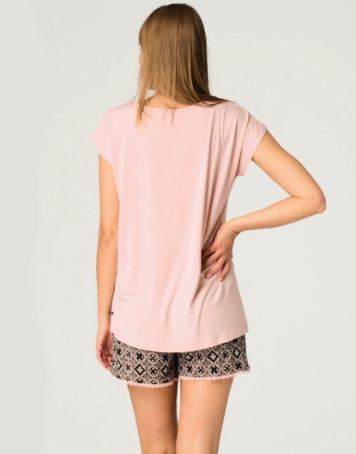 Dámské letní pyžamo - jemná viskóza - tričko s krátkým rukávem - třpytivý diamantový potisk na hrudi - krátké vzorované kraťasy - nastavitelný pas se stahovací šňůrkou - kapsy po stranách - nohavice zakončené krajkovou stuhou Složení: 95% bambus, 5% elastan