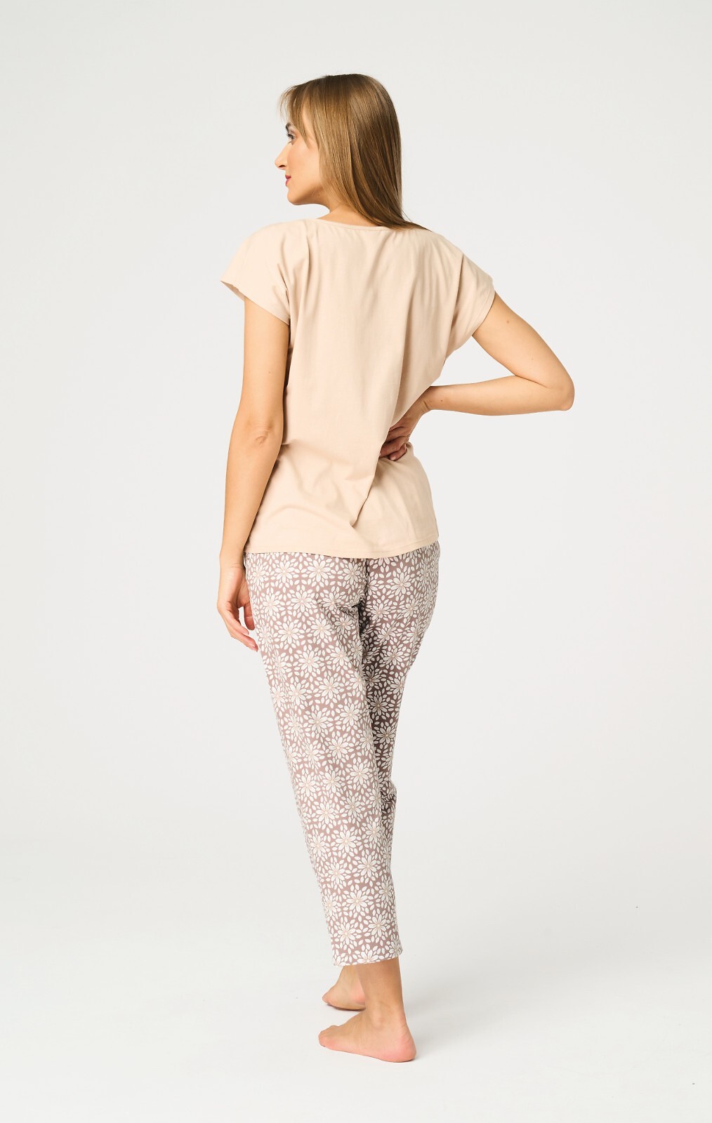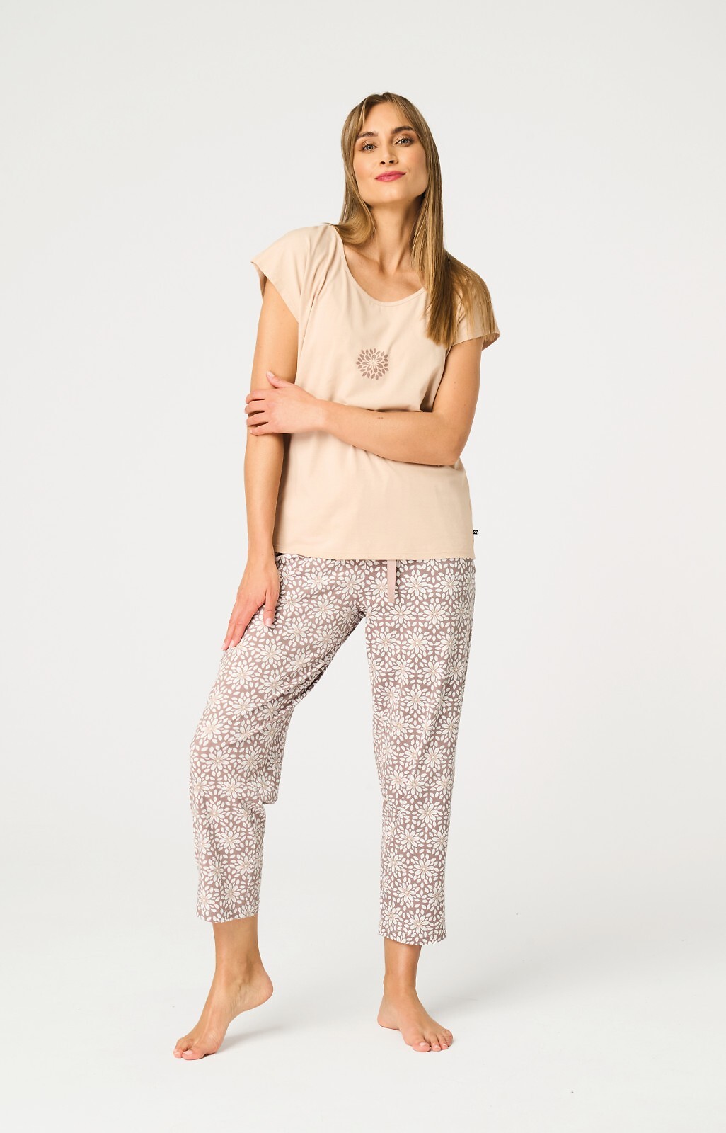 Dámské pyžamo - krátký rukáv - vyrobené z vysoce kvalitní bavlny - hladká halenka s jemným potiskem a lesklým zirkonem - vzorované kalhoty délky 7/8 - pohodlné kapsy na bocích Složení: 95% bavlna, 5% elastan