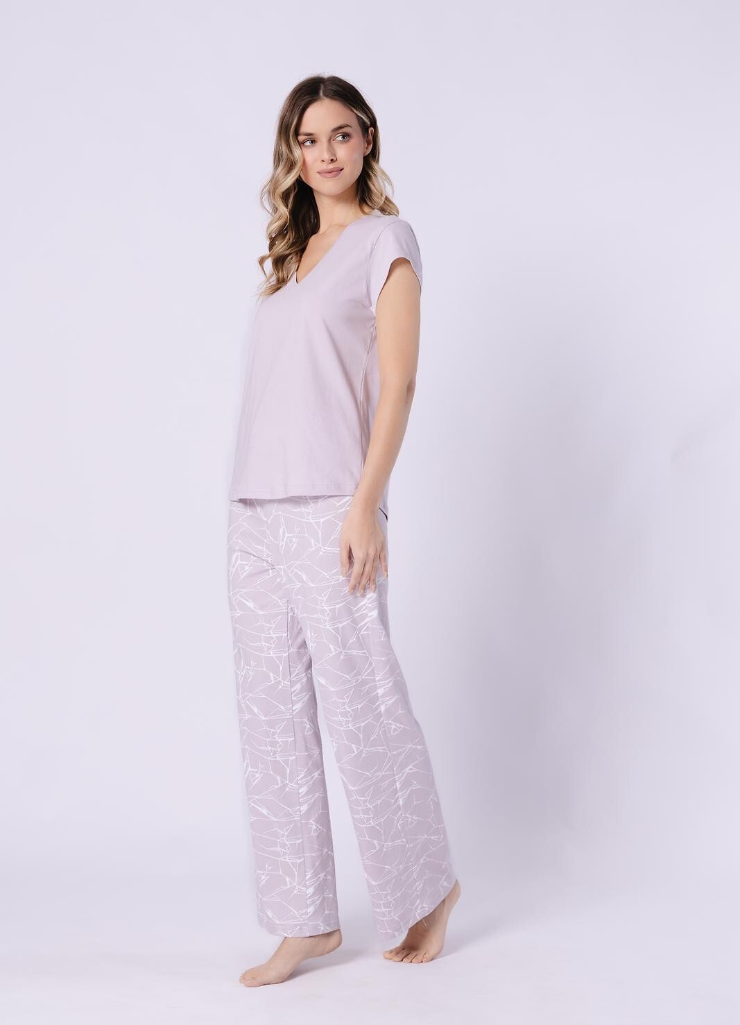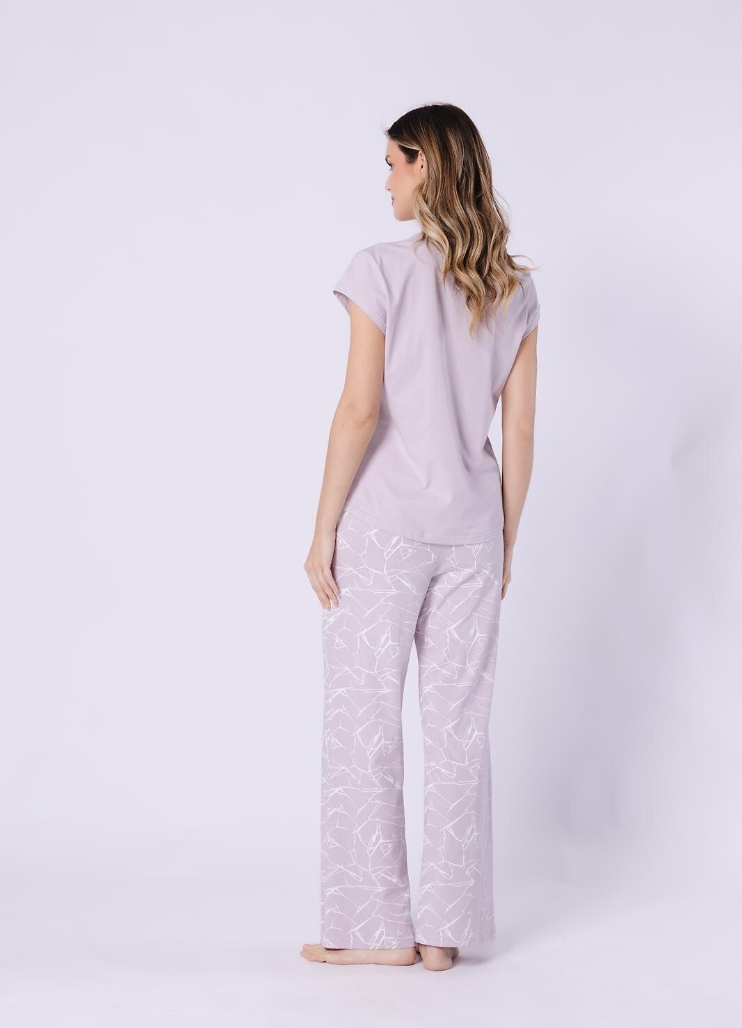 Dámské bavlněné pyžamo - tričko s krátkým rukávem - výstřih do V - vzorované, dlouhé nohavice - elastický pas lemovaný bavlnou a zdobený mašlí. Složení: 100% bavlna