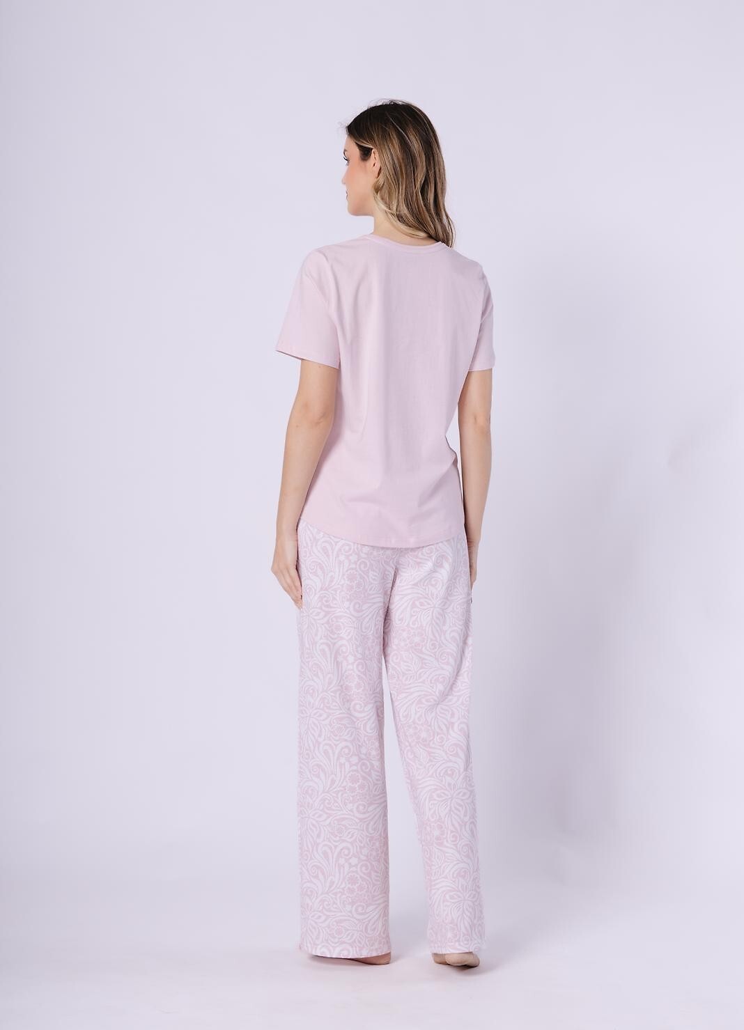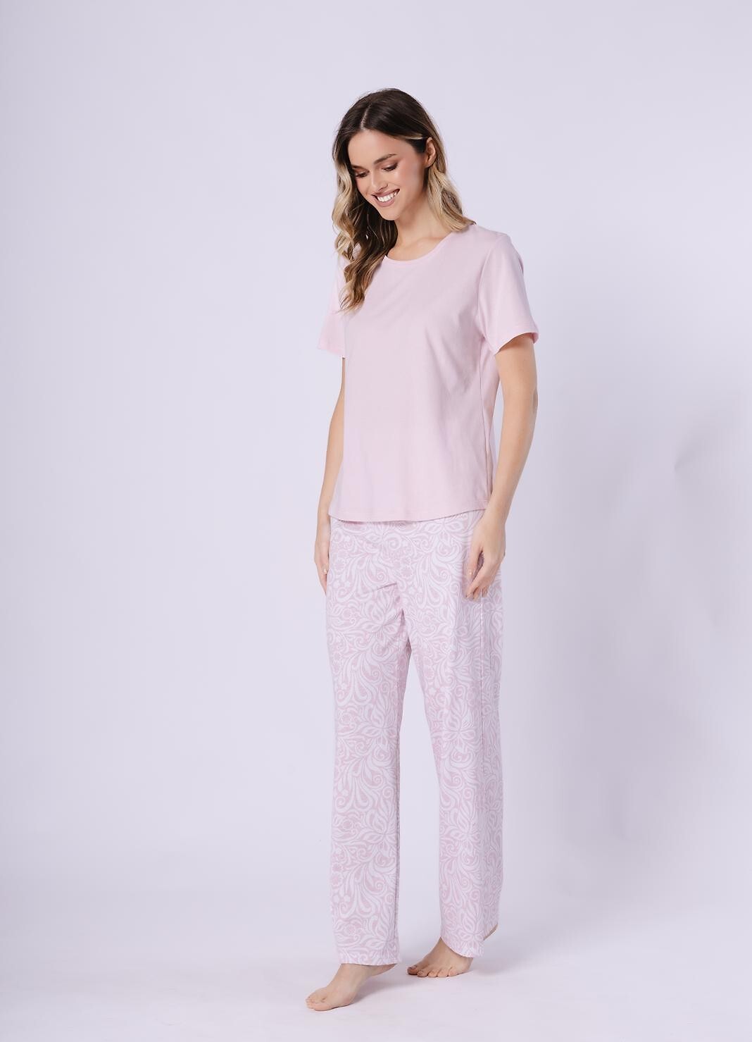 Dámské pyžamo - vysoce kvalitní, jemná bavlna - hladké tričko - kulatý výstřih - dlouhé kalhoty zdobené květinovým vzorem - ozdobná saténová mašle v pase Složení: 100% bavlna