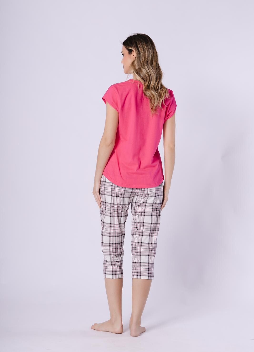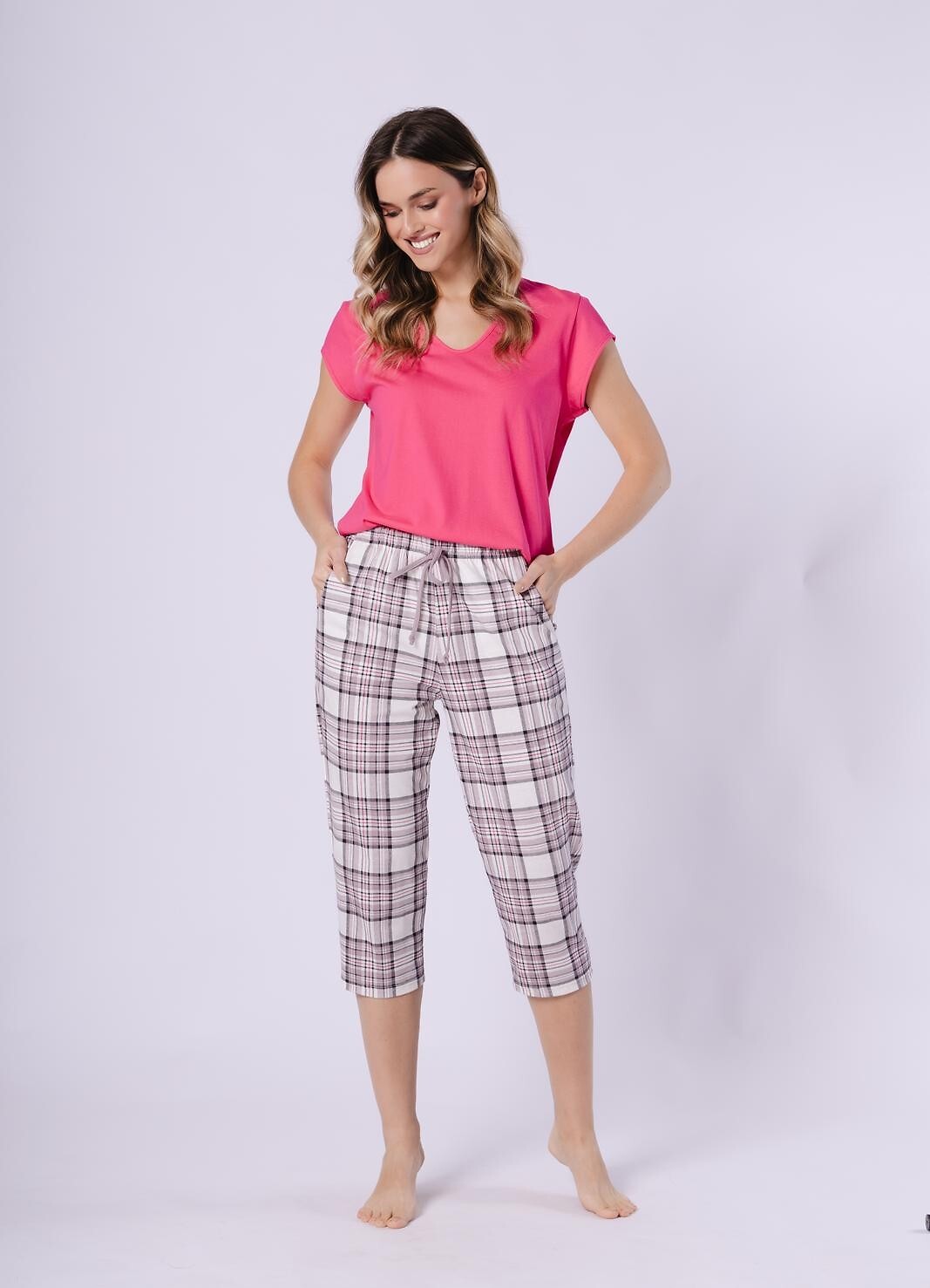 Dámské bavlněné pyžamo - tričko s krátkým rukávem - výstřih do V - vzorované tříčtvrteční kalhoty - elastický pas s bavlněným lemem - kapsy v úrovni boků Složení: 100% bavlna