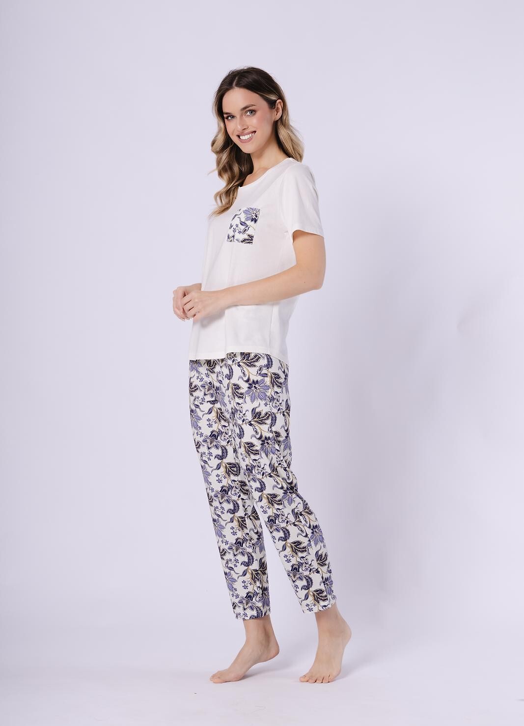 Dámské bavlněné pyžamo - tričko s krátkým rukávem - půlkulatý výstřih - malá kapsa ve výšce hrudníku - vzorované, dlouhé nohavice - elastický pas lemovaný bavlnou a zdobený mašlí. Složení: 100% bavlna