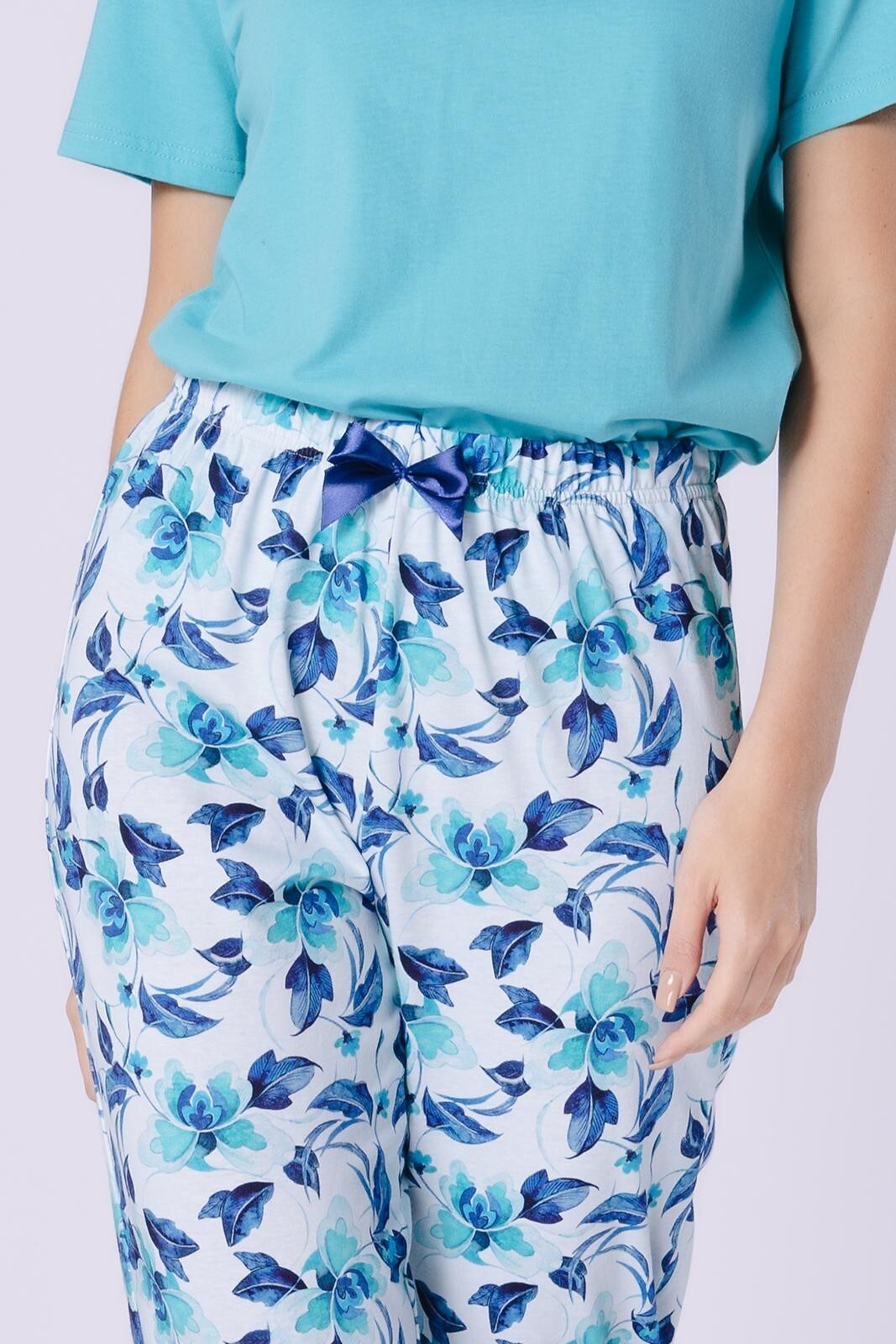 Dámské bavlněné pyžamo - tričko s krátkým rukávem - půlkulatý výstřih - vzorované kalhoty délky 7/8 - elastický pas lemovaný bavlnou a saténovou mašlí. Složení: 100% bavlna