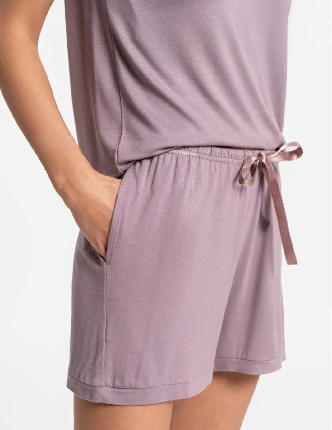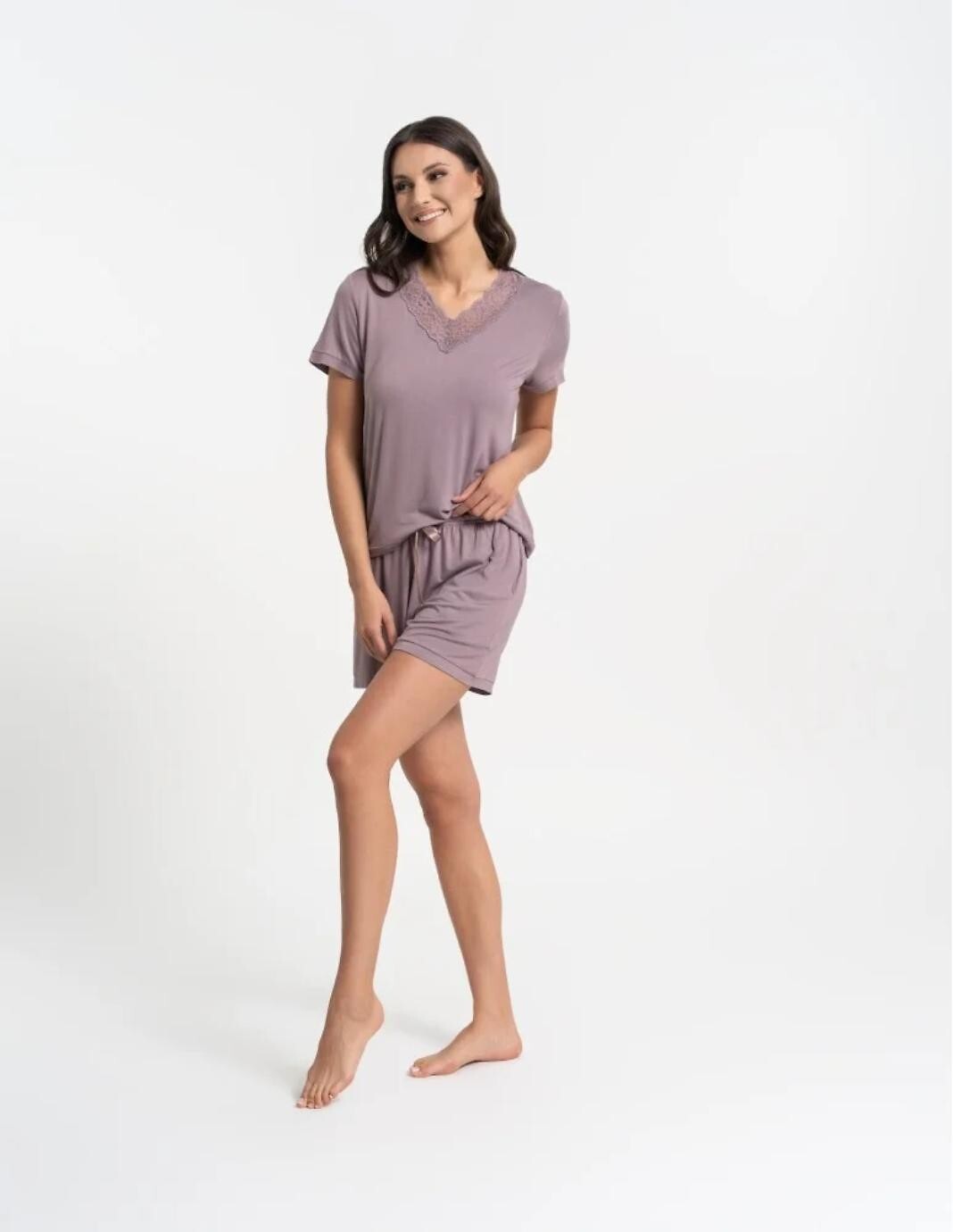 Dámské pyžamo - vysoce kvalitní bambusová viskóza - tričko s krátkým rukávem - výstřih do V lemovaný krajkou - sladěné kraťasy - pohodlné kapsy v úrovni boků - saténová mašle v pase - baleno v plastovém sáčku Složení: 95% bambusová viskóza, 5% elastan