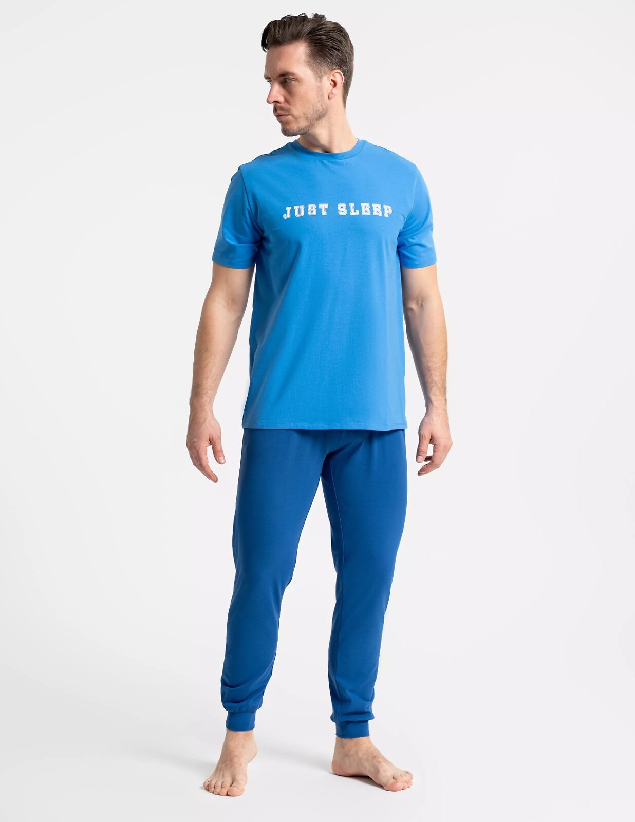 Pánské pyžamo - vysoce kvalitní bavlna - jednobarevné tričko s krátkým rukávem - kulatý výstřih - přední část zdobená barevným nápisem - dlouhé, jednobarevné nohavice - nohavice zakončené stahovací šňůrkou - pohodlný elastický pas - kapsy na bocích - baleno v plastovém sáčku Složení: 95% bavlna, 5% elastan