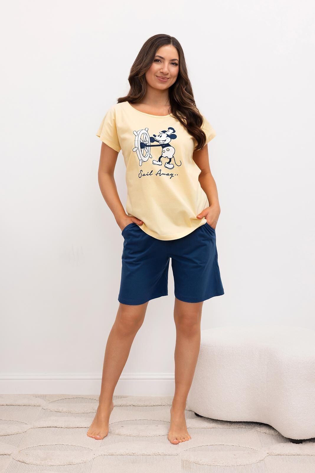 Dámské bavlněné pyžamo - tričko s krátkým rukávem - přední strana zdobená potiskem Mickey Mouse - kulatý výstřih - krátké, hladké kraťasy - kapsy na bocích - elastický pas Složení: 100% bavlna