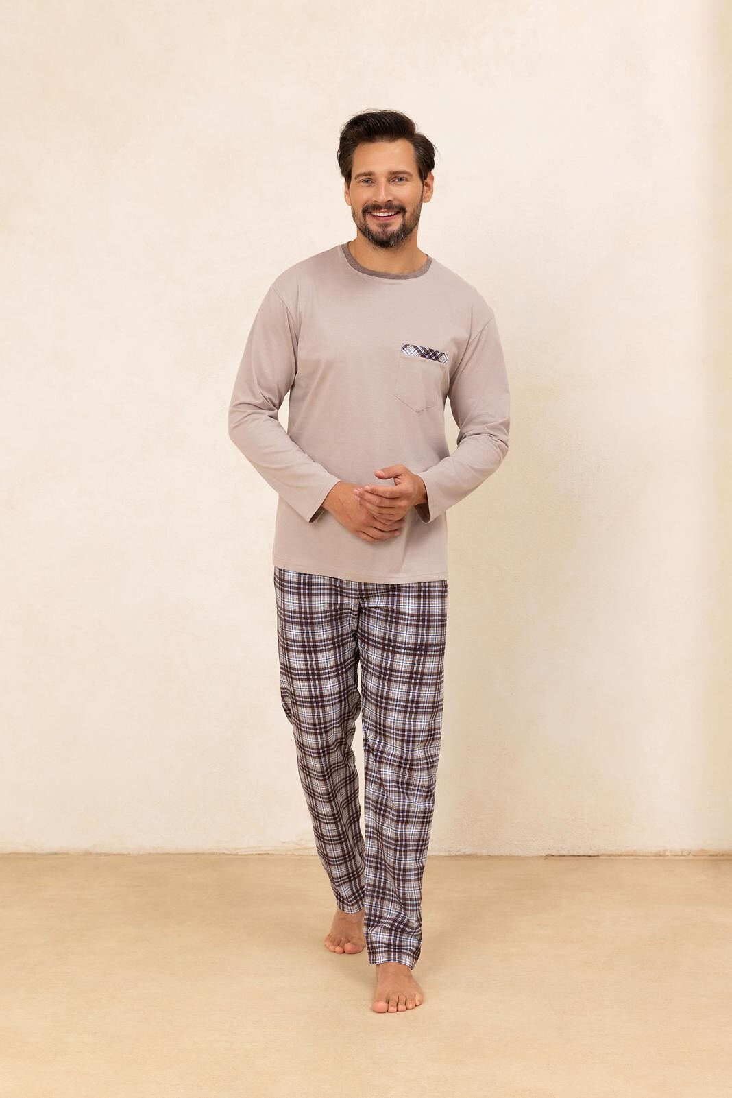 Pánské bavlněné pyžamo - tričko s dlouhým rukávem - kulatý výstřih - nakládaná kapsa ve výšce hrudníku - dlouhé nohavice, kostkovaný vzor. Složení: 100% bavlna.