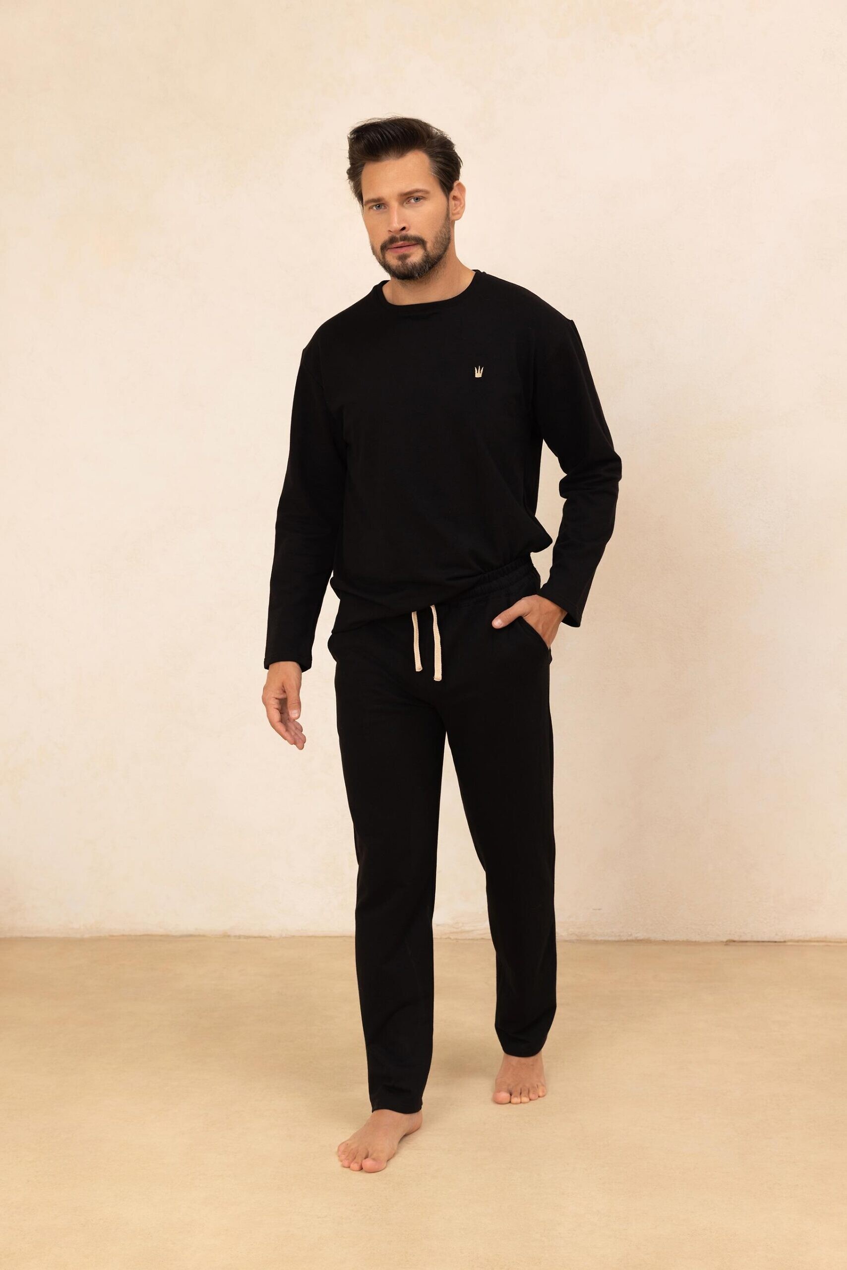 Teplé pánské pyžamo - tričko s dlouhým rukávem - půlkulatý výstřih - sladěné dlouhé, hladké kalhoty s kapsami - vnitřní strana s teplým nadýchaným materiálem. Složení: 92% bavlna, 8% elastan