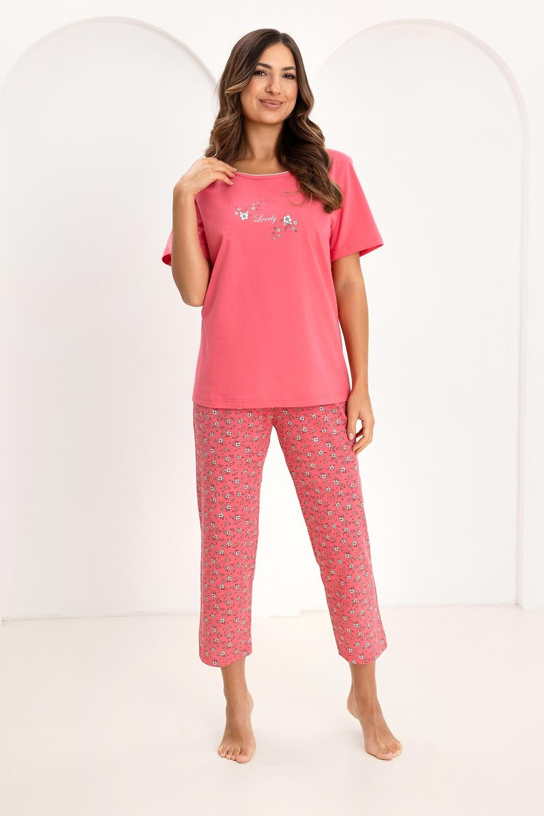 Dámské bavlněné pyžamo - tričko s krátkým rukávem - kulatý výstřih - ozdobný potisk na přední straně - vzorované kalhoty délky 7/8 - elastický pas s bavlněným lemem Složení: 100% bavlna