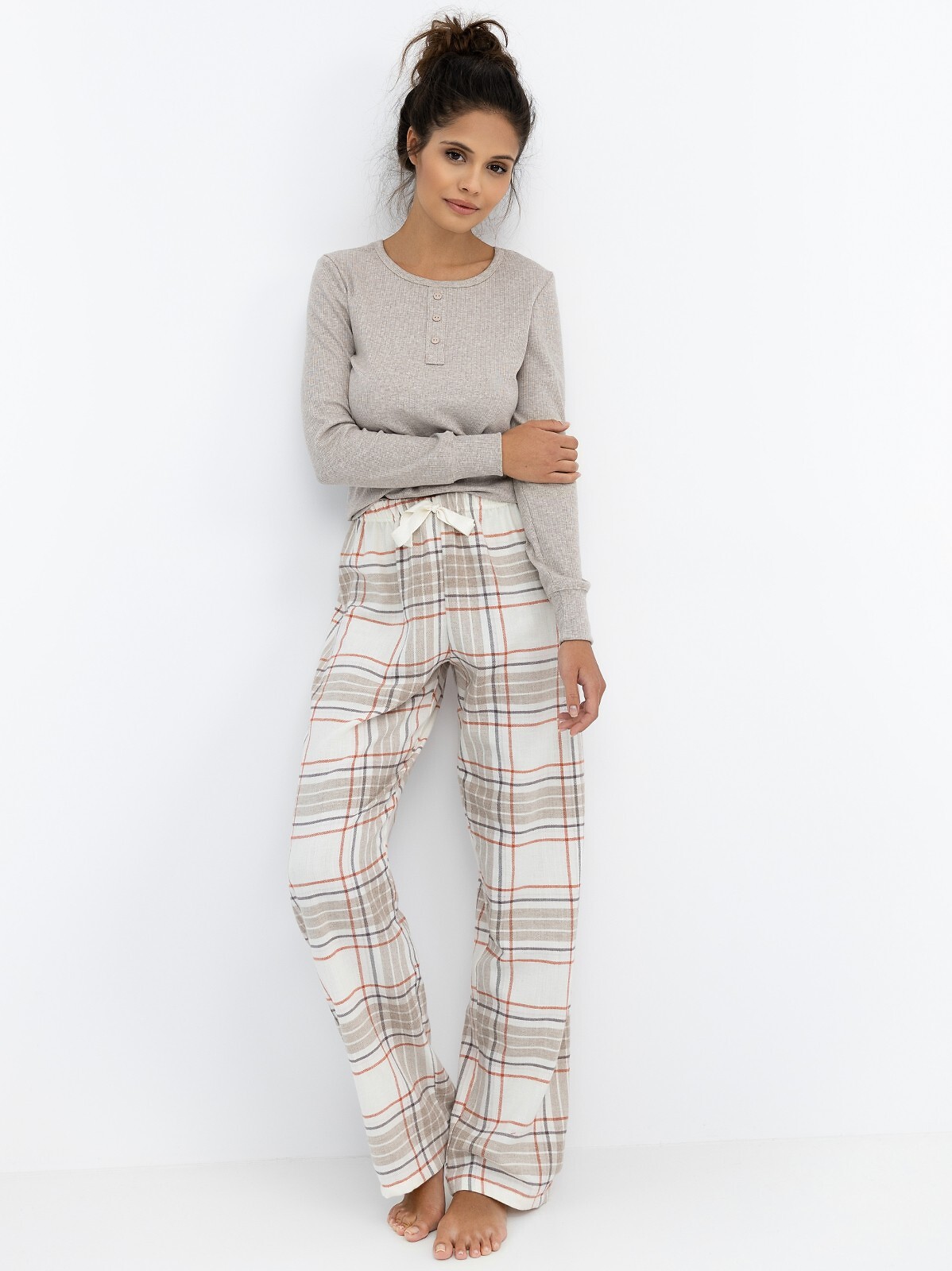 Dámské pyžamo - vyrobené ze směsi vysoce kvalitních úpletů - melanžové tričko s jemným proužkem - výstřih s knoflíkovou légou - dlouhé rukávy - žebrované manžety - dlouhé flanelové kalhoty s kostkovaným vzorem součástí balení - elastický pas a stuha na zavazování Složení: Tričko 47% bavlna, 47% polyester, 6% elastan kalhoty: 90% bavlna, 10% polyester