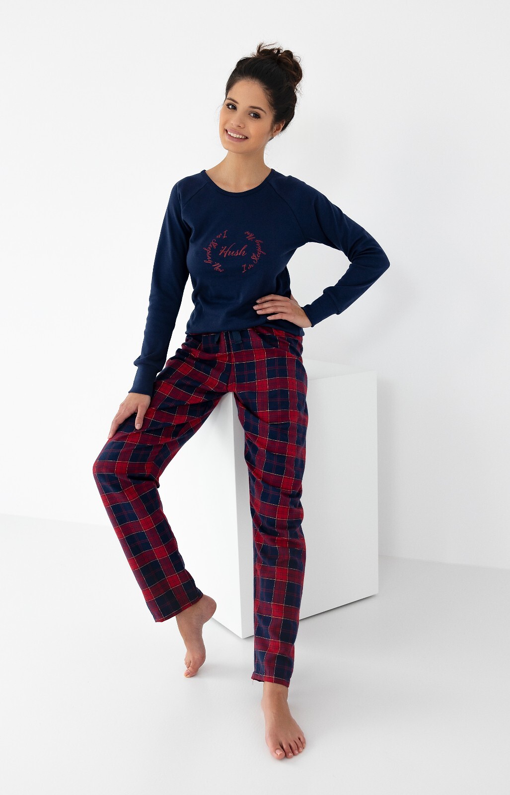 Dámské pyžamo - tričko z kvalitního bavlněného úpletu - dlouhé rukávy - jednobarevná výšivka na přední straně - dlouhé nohavice z kostkované flanelové látky s lesklou lurexovou nití - zavazování v pase stuhou Složení: tričko 100% bavlna; kraťasy 64% bavlna, 35% polyester, 1% lurex