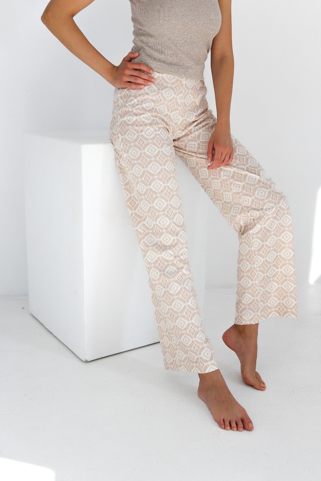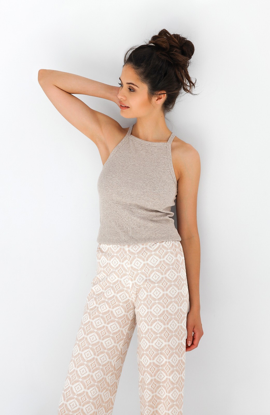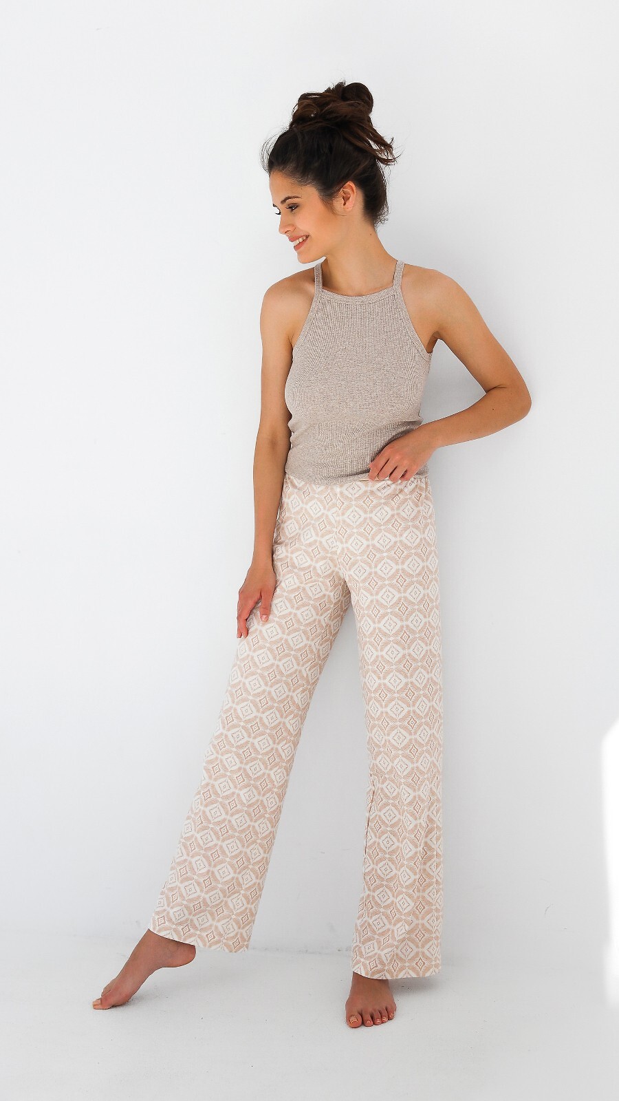Dámské letní pyžamo - žebrovaný úpletový top - silně odhalená ramena - dlouhé kalhoty ze vzorované bavlny - rovné, široké nohavice - vysoký pas Složení: tričko 47% bavlna, 47% polyester, 6% elastan; kalhoty 100% bavlna