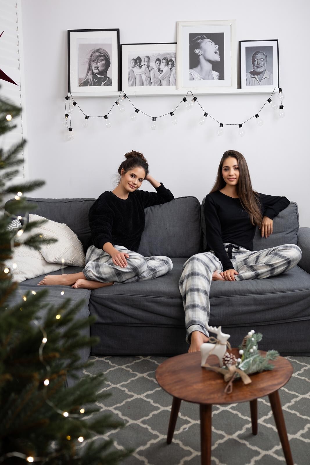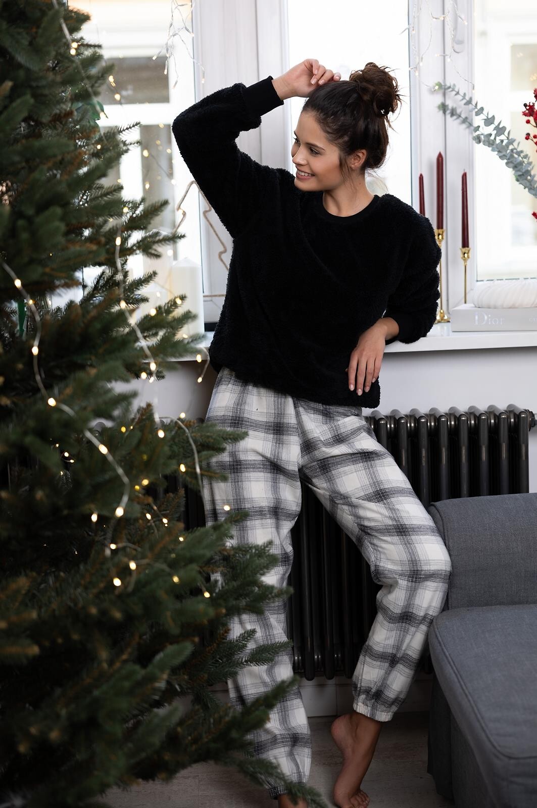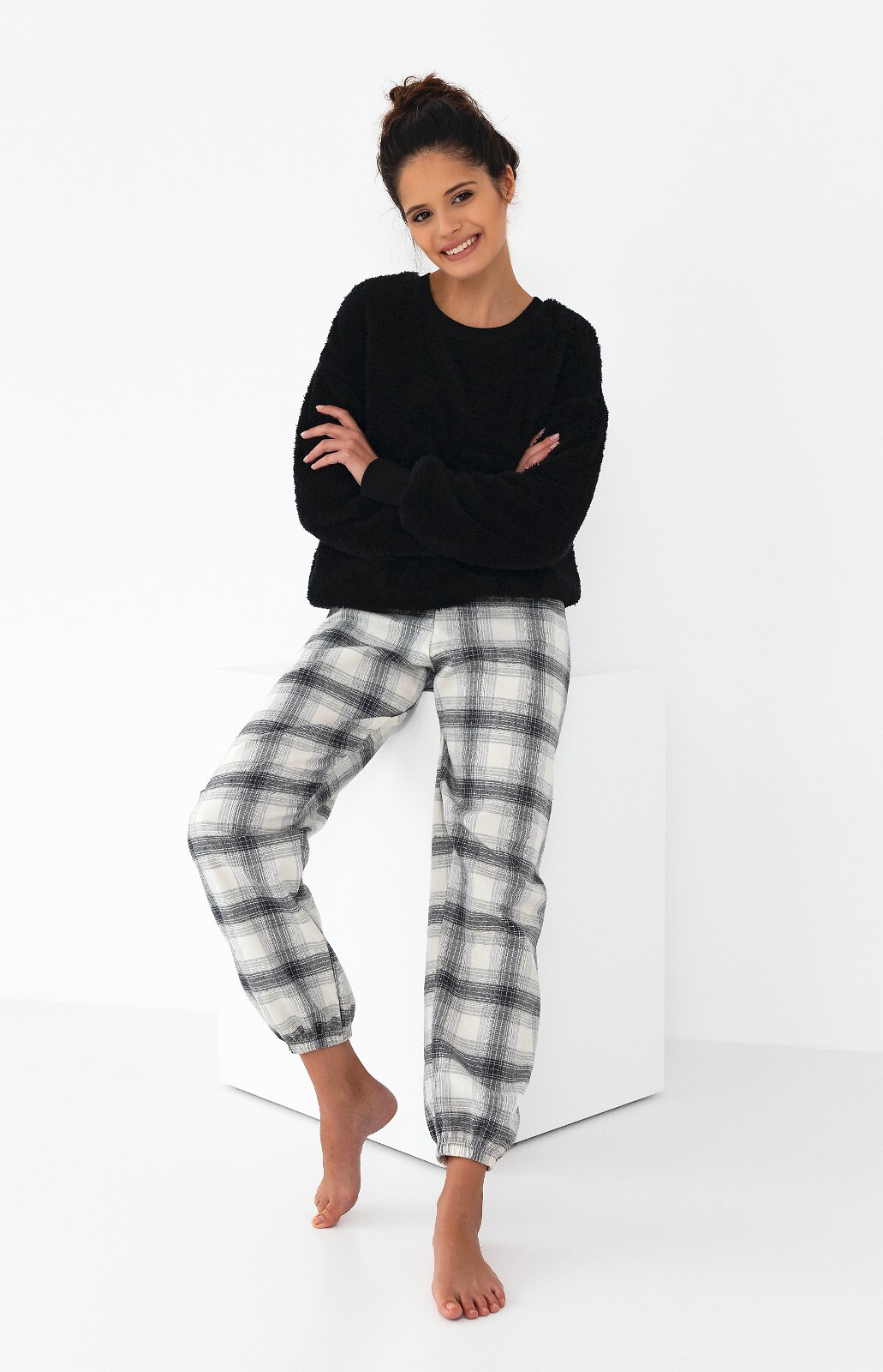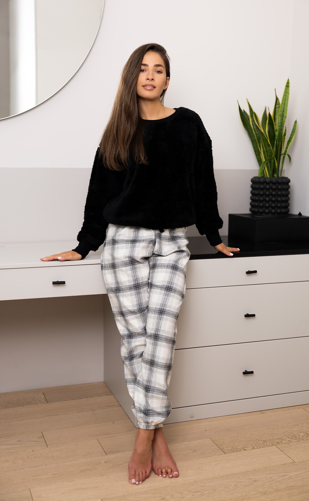 Teplé dámské pyžamo - silná mikina z měkkého úpletu - dlouhé rukávy - výstřih a manžety lemované žebrovaným úpletem - dlouhé flanelové kalhoty - nohavice zakončené gumou v tunýlku Složení: mikina 100% polyester, kalhoty 70% bavlna, 30% polyester