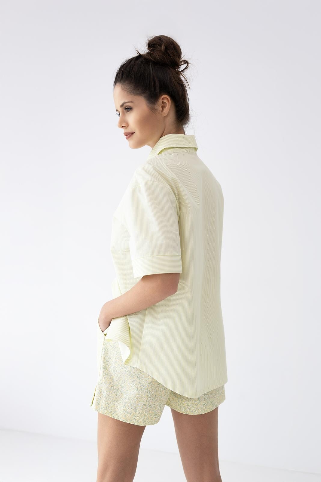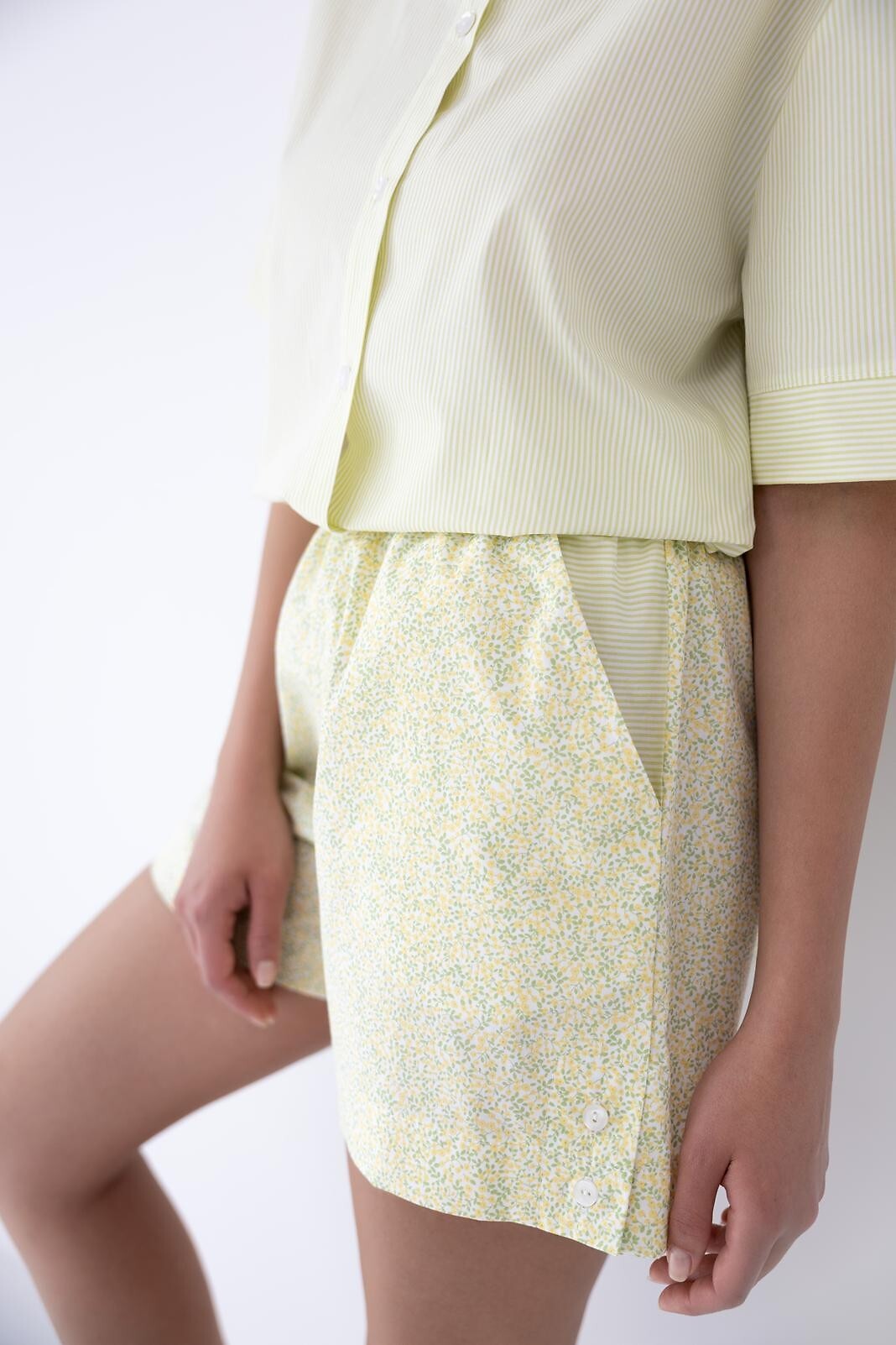 Dámské letní pyžamo - vysoce kvalitní bavlněná tkanina - pruhované tričko s krátkým rukávem - s límečkem, zapínání na knoflíky - krátké kraťasy, květinový vzor - pohodlný elastický pas - kapsy v úrovni boků - nohavice zdobené našitými knoflíky - baleno v plastovém sáčku Složení: 100% bavlna
