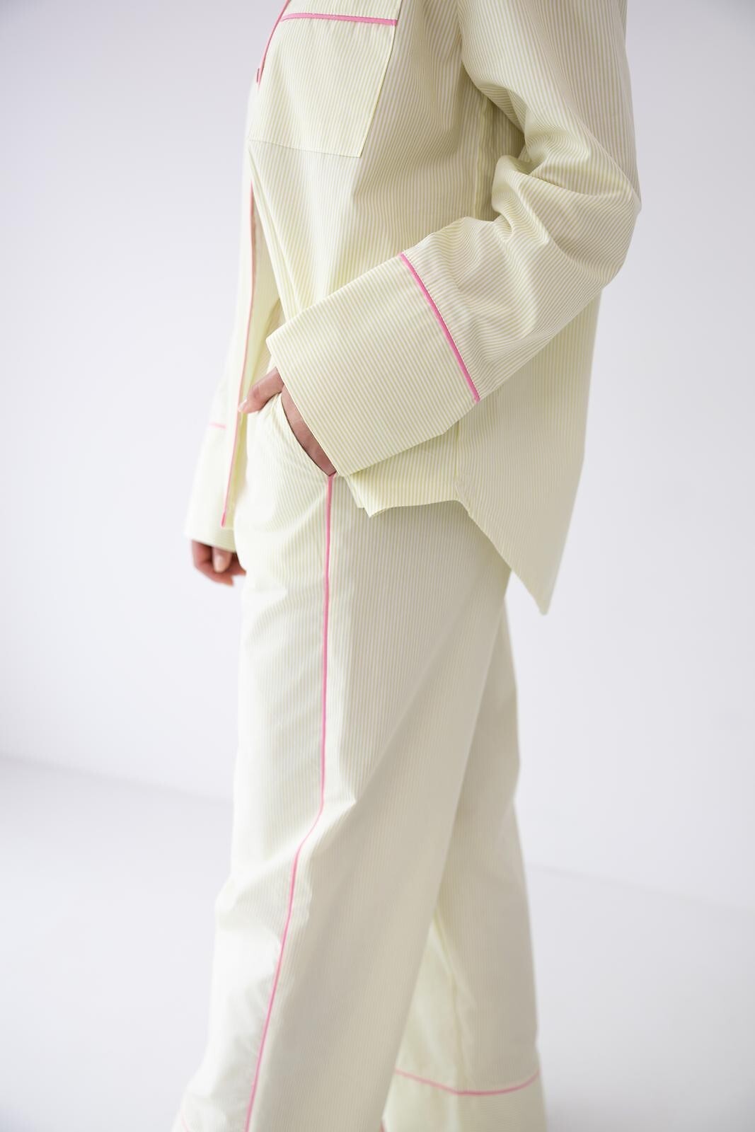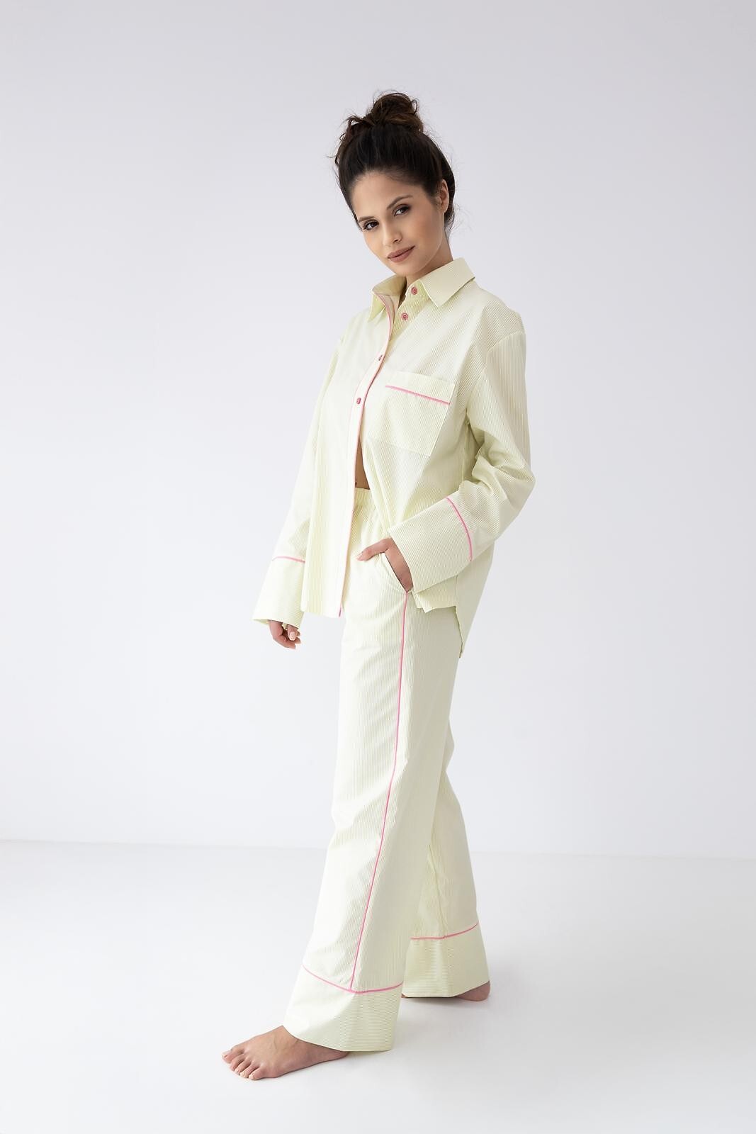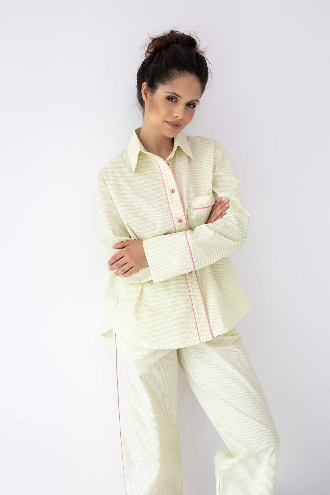 Dámské pyžamo - vysoce kvalitní bavlněný materiál - pruhovaný potisk - košile s dlouhým rukávem - s límečkem, zapínání na knoflíky - dlouhé rovné kalhoty v barvě střihu - elastický pas s úpletem - pohodlné kapsy v úrovni boků - vše zdobené růžovým lemováním. Složení: 100% bavlna