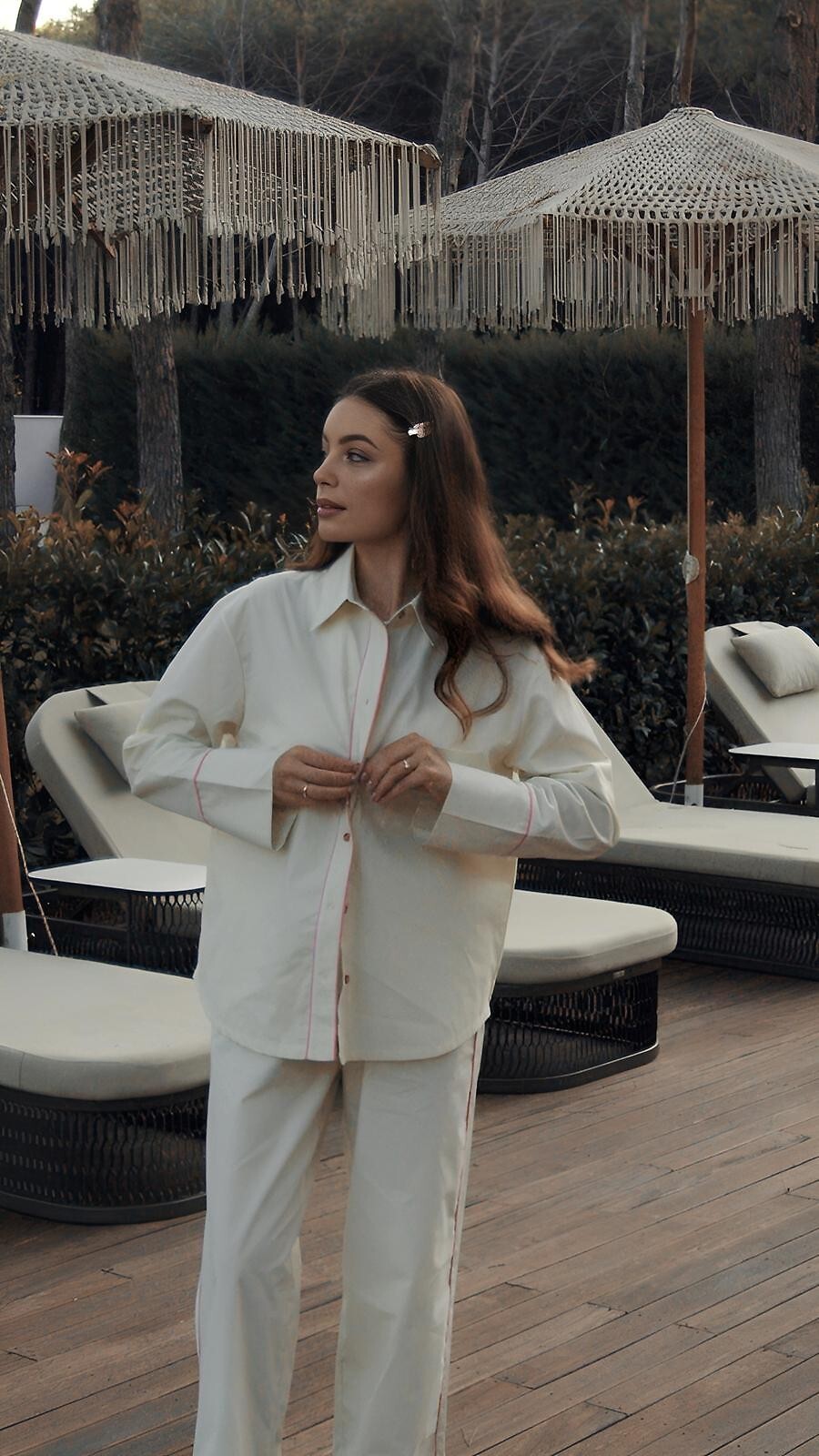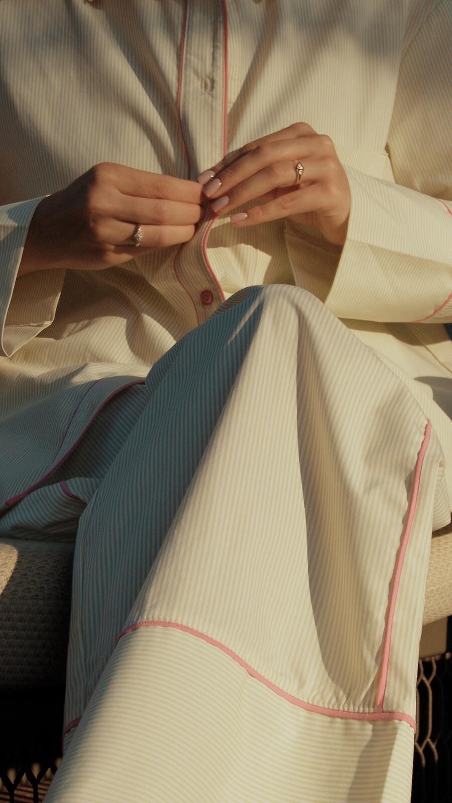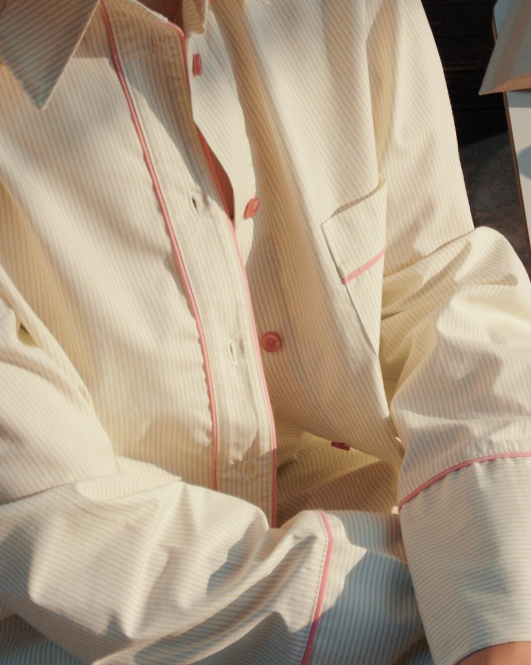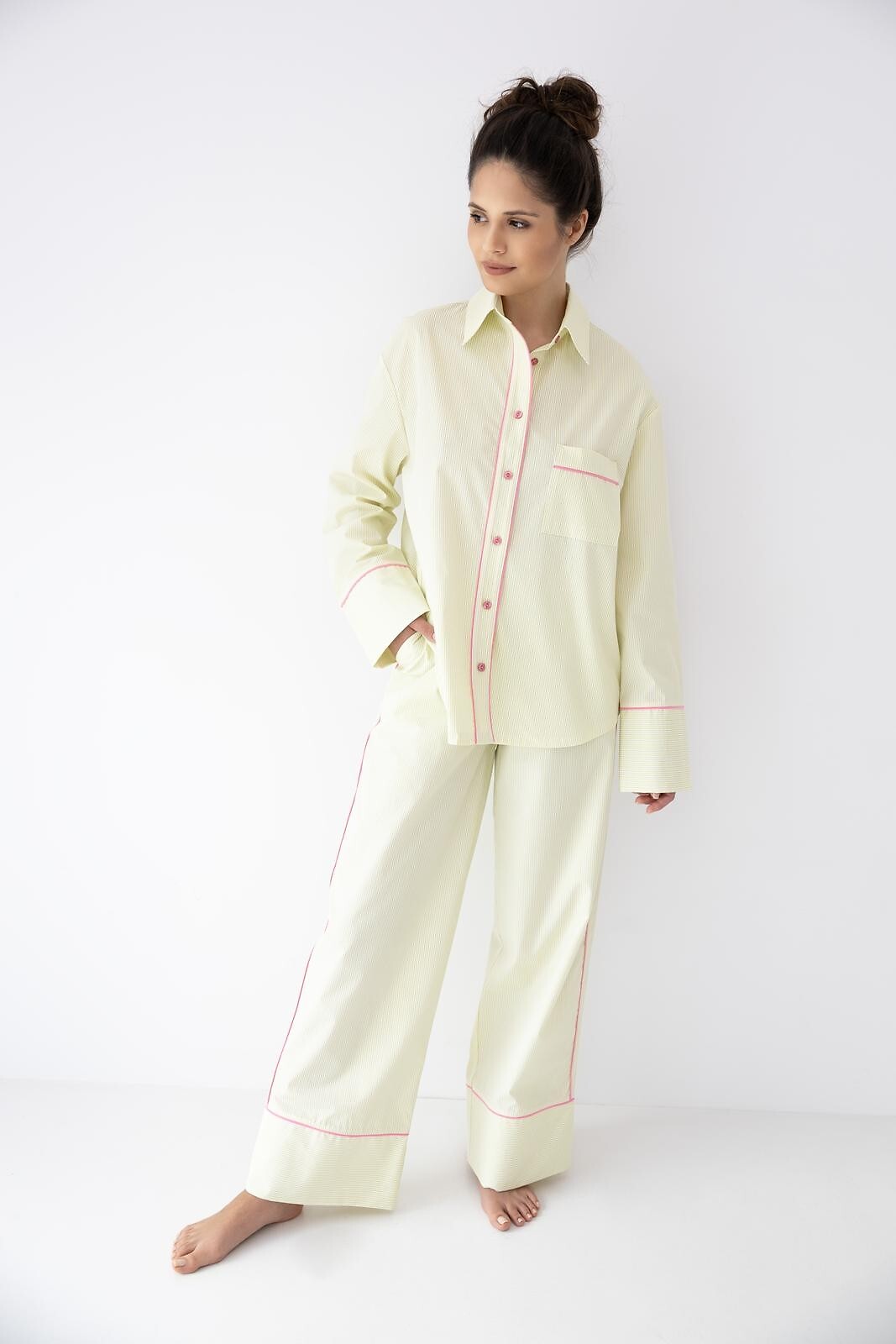 Dámské pyžamo - vysoce kvalitní bavlněný materiál - pruhovaný potisk - košile s dlouhým rukávem - s límečkem, zapínání na knoflíky - dlouhé rovné kalhoty v barvě střihu - elastický pas s úpletem - pohodlné kapsy v úrovni boků - vše zdobené růžovým lemováním. Složení: 100% bavlna