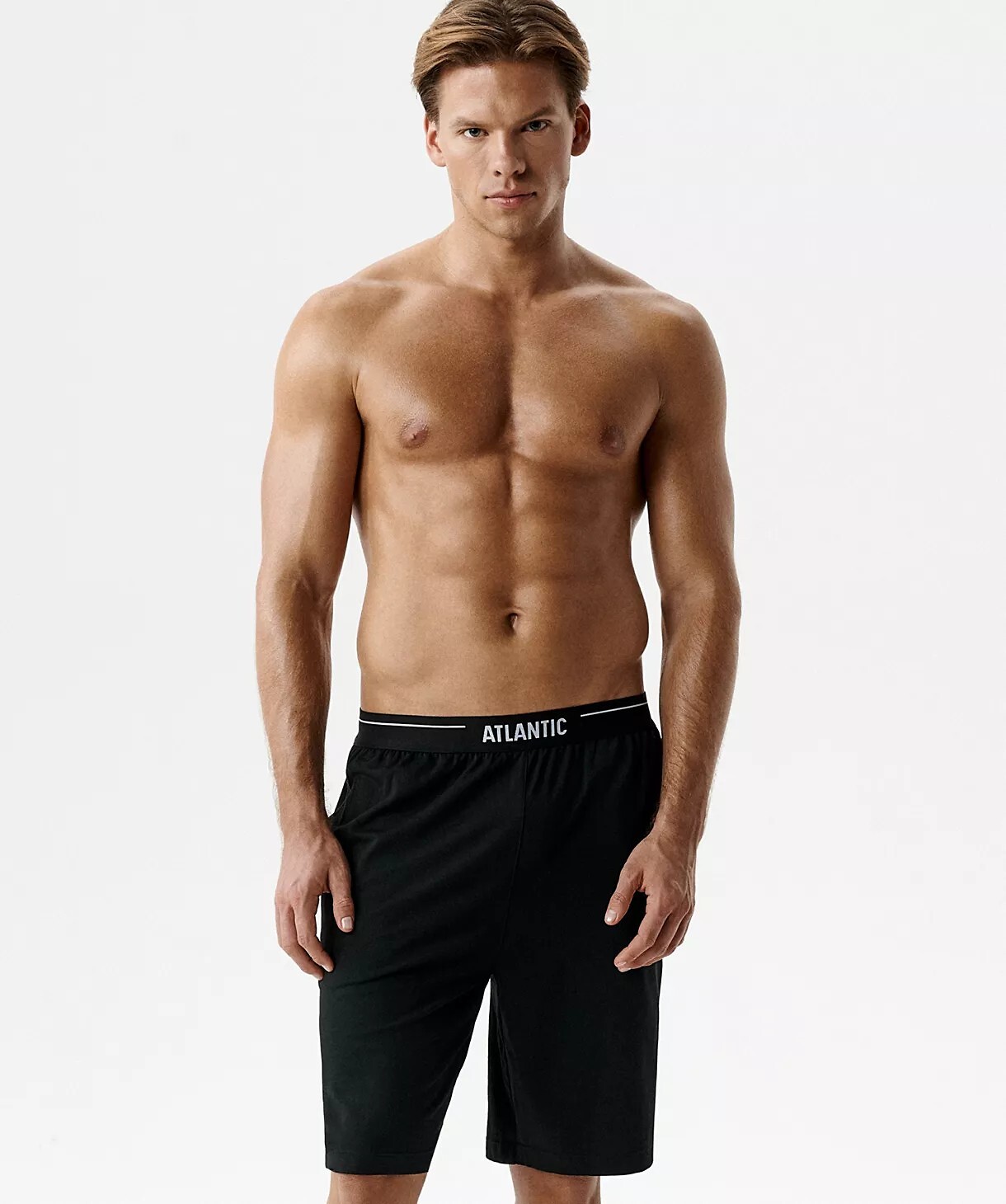 Pánské pyžamové kraťasy - měkký, příjemný na dotek úplet - volný, pohodlný střih s nohavicemi po kolena - pohodlné kapsy po stranách - plochý, velmi jemný elastický pas s nápisem Atlantic Složení: 95% bavlna, 5% elastan