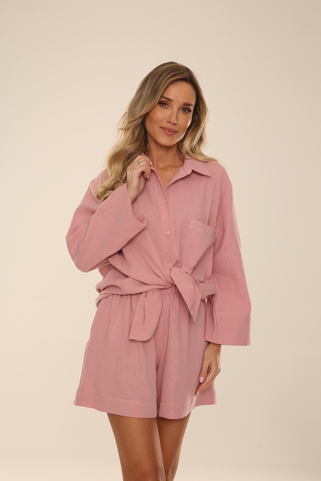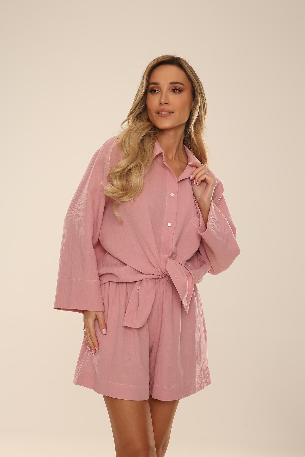 Dámské pyžamo - jemná, mušelínová tkanina - volné tričko se 7/8 rukávy - s límečkem, zapínání na knoflíky, našitá kapsa na hrudi - rozparky ve spodní části - krátké kraťasy s kapsami - pohodlný elastický pas - ideální i pro každodenní nošení, jako letní komplet - baleno v plastovém sáčku Složení: 100% bavlna