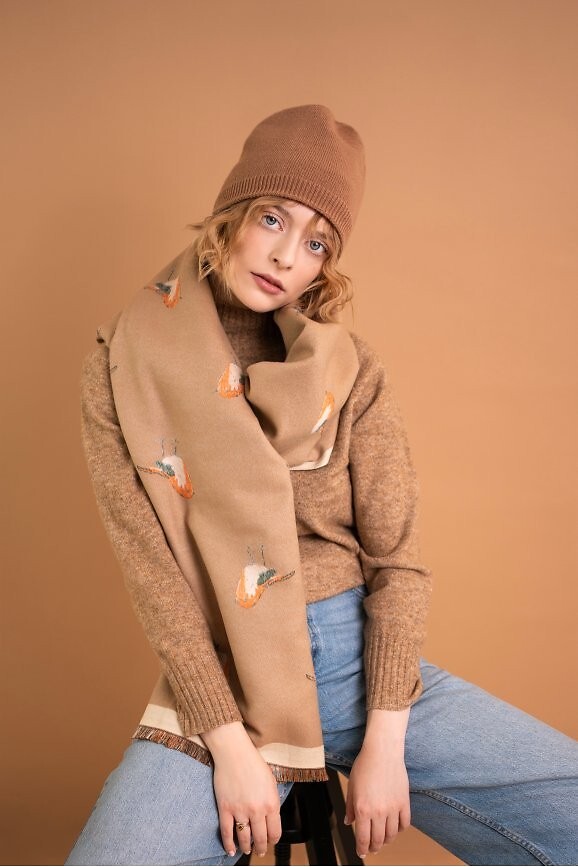 Velká dámská zimní šála - zdobená roztomilými ptáčky - vyrobená z měkkého, k pokožce příjemného materiálu - tlumené barvy a drobné třásně jí dodávají jemný nádech. Složení: 80% polyester, 20% viskóza