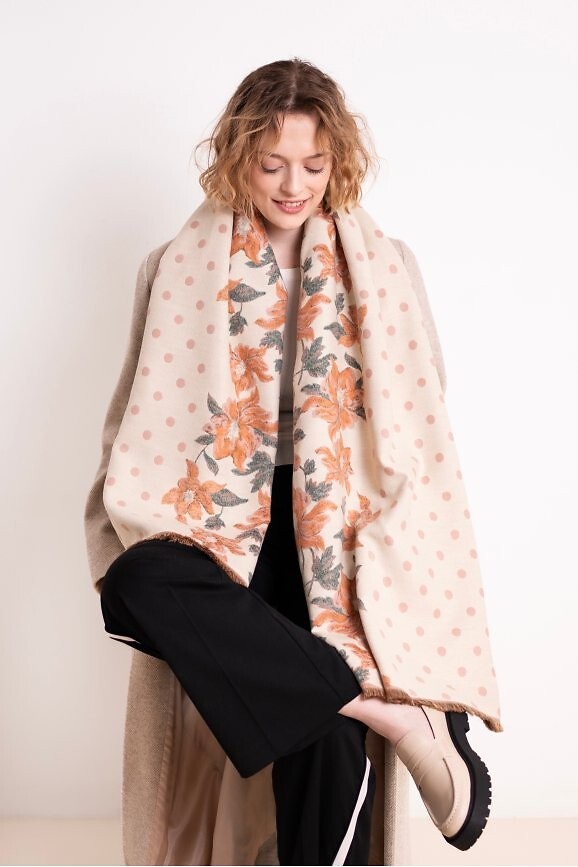 Teplá dámská šála - zdobená květinovým motivem a decentními puntíky - vyrobená z měkkého, k pokožce příjemného materiálu s přídavkem bavlny - velké velikosti, které vám umožní se do ní pohodlně zabalit i v mrazivých dnech. Složení: 80% polyester, 20% bavlna.