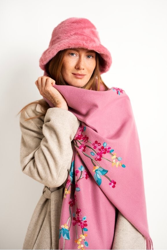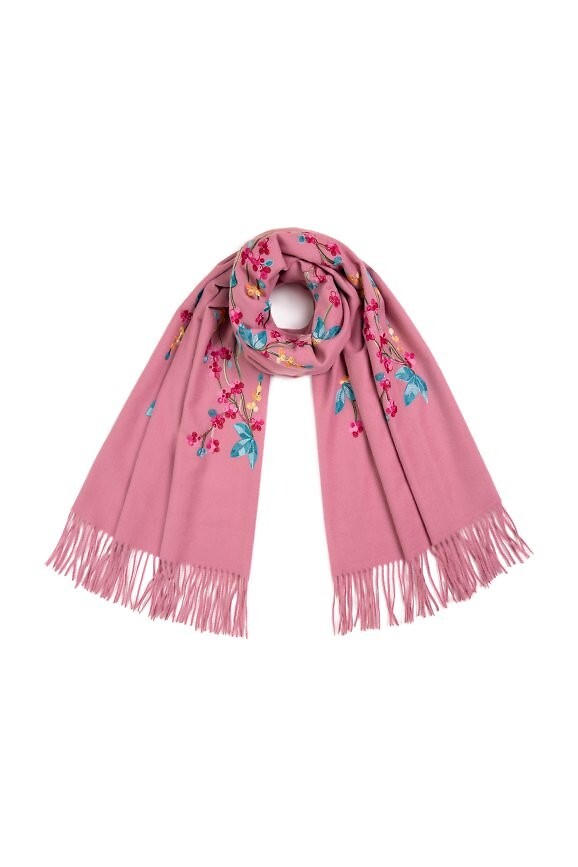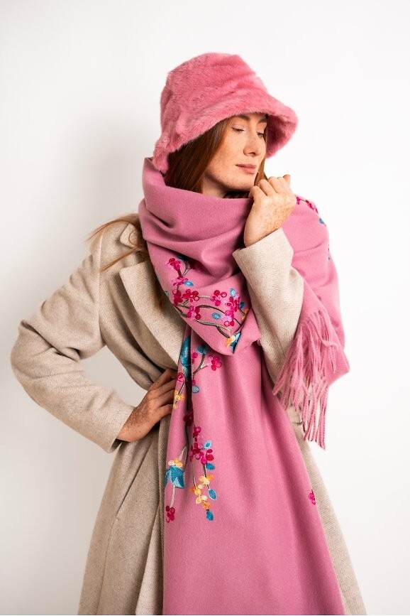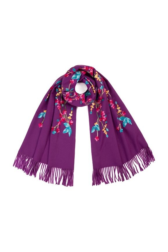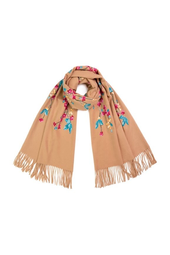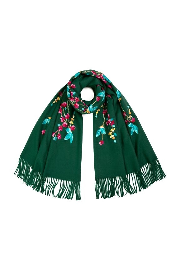 Velký dámský šátek - zdobený barevnou květinovou a orientální výšivkou - lze nosit přes ramena pro zdůraznění jedinečného vzoru, nebo se do něj zabalit v mrazivých dnech - vyrobený z příjemného materiálu s příměsí bavlny a vlny. Složení: 60% polyester, 30% bavlna, 10% vlna