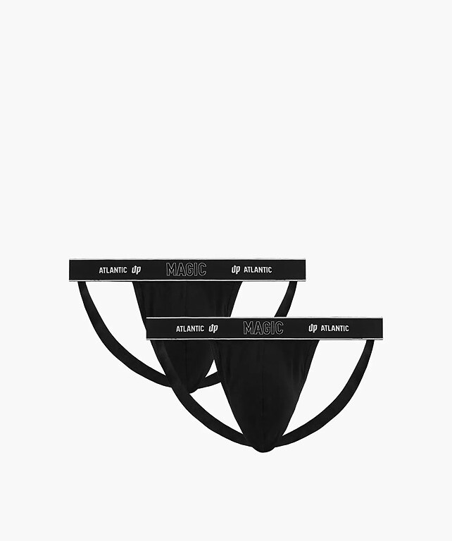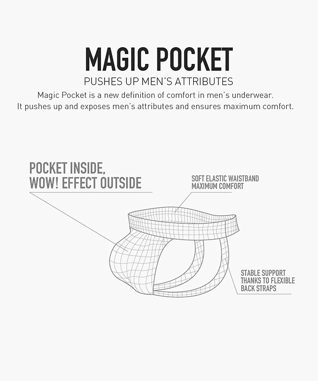 Jockstrapové kalhotky Magic Pocket – model vytvořený pro muže, kteří rádi zdůrazňují své přednosti - sexy a sportovní charakter a střih - zvedací a zvětšující atributy - odhalený spodní díl a nízký pas - měkká, nekompresní vnější guma - nejvyšší kvalita a pohodlí nošení - model skimpy střihu má nízký pas označený měkkou, nekompresní gumou s logem Atlantic a nápisy Magic Up - vzadu spodní prádlo zcela odhaluje zadeček - hýždě jsou podepřeny pouze elastickými ramínky, která zajišťují stabilitu a pohodlí nošení - vpředu je speciálně tvarovaný košík s technologií Magic Pocket - kapsa, která zvedá a opticky zvětšuje penis a zdůrazňuje mužskou siluetu - kalhotky jsou vyrobeny z bavlněného strečového úpletu. Složení: 95% bavlna, 5% elastan