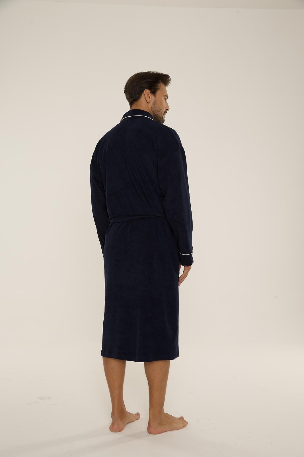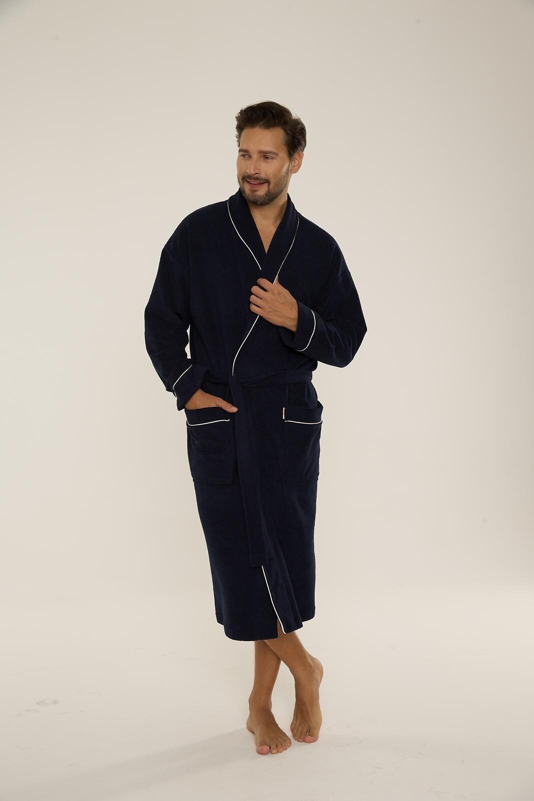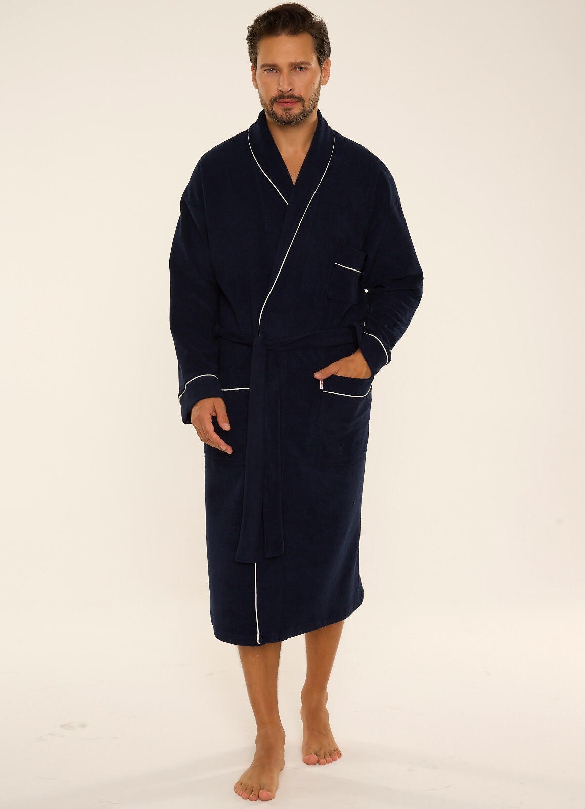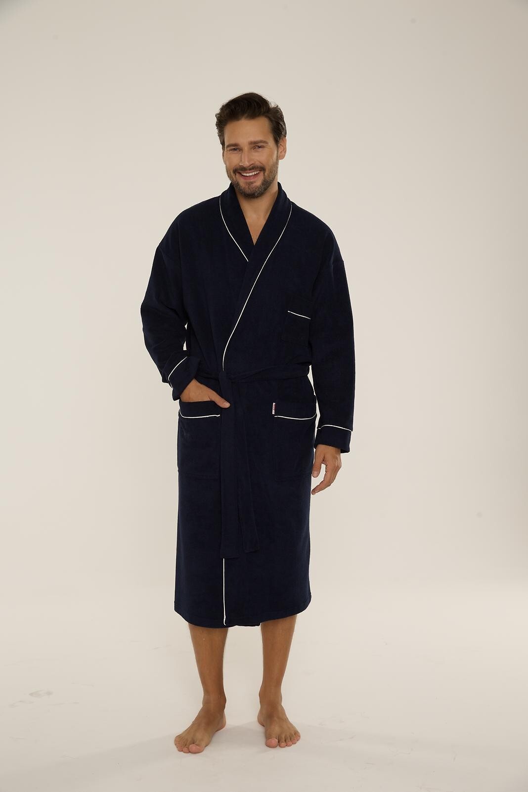 Pánský dlouhý župan - se šálovým límcem - zavazování v pase - nakládané kapsy na bocích - příjemný na dotek, froté - perfektně saje vodu - zakončený šedým lemováním. Složení: 80% bavlna, 20% polyamid