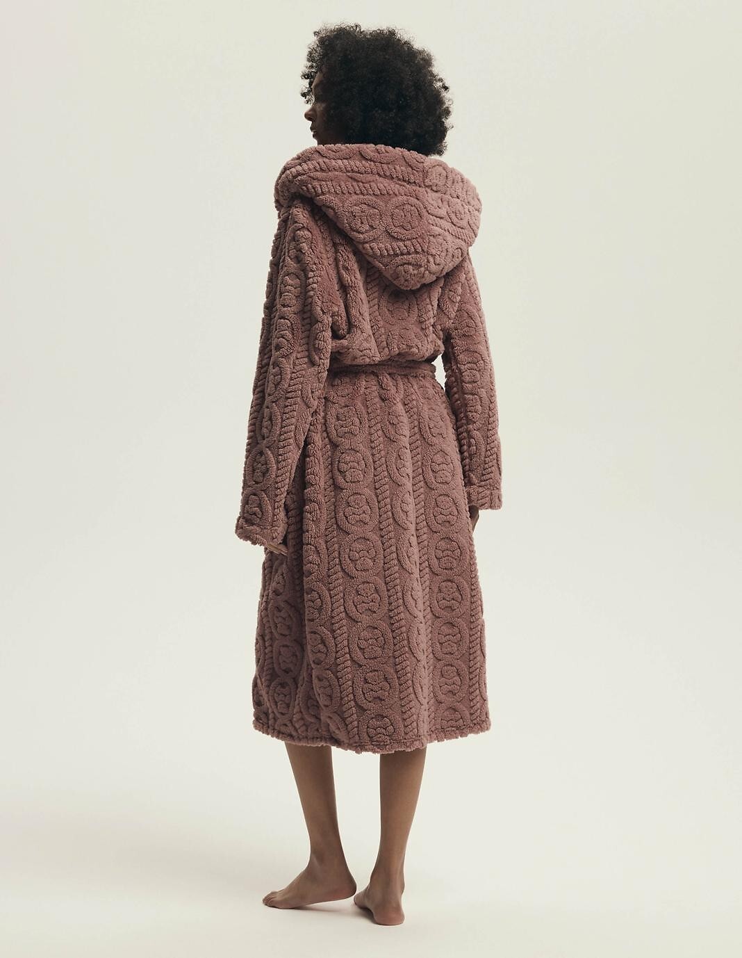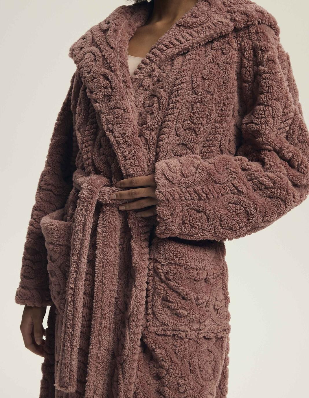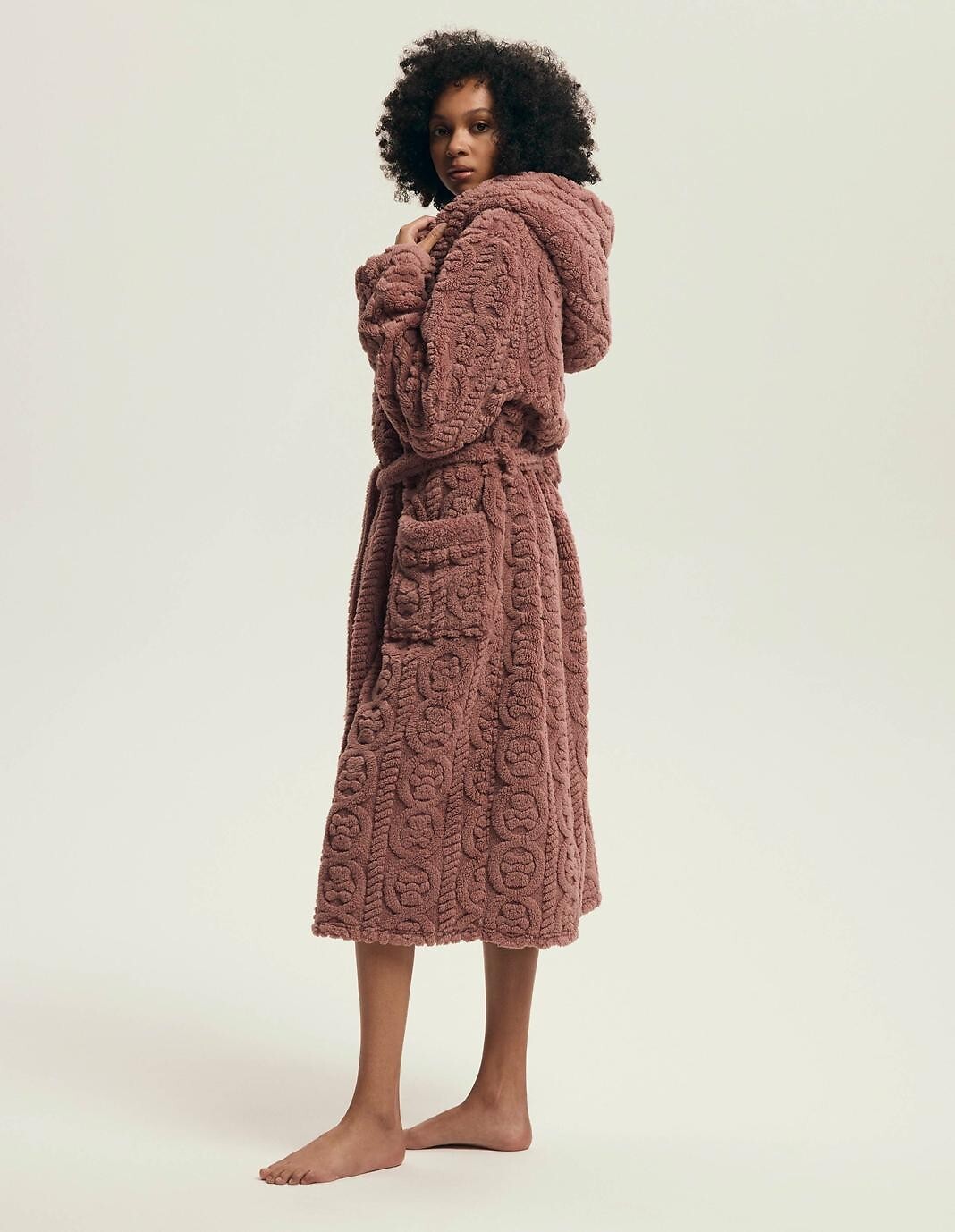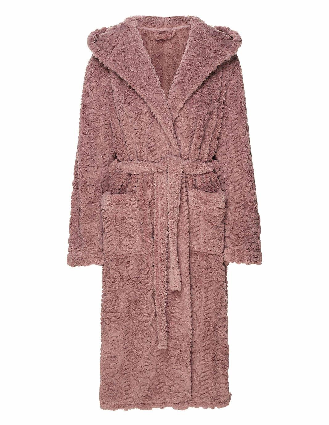 Dámský župan s kapucí - měkký úplet s vyvýšeným vzorem - dlouhé rukávy - zavazování v pase, s kapsami - délka po lýtka Složení: 100% polyester