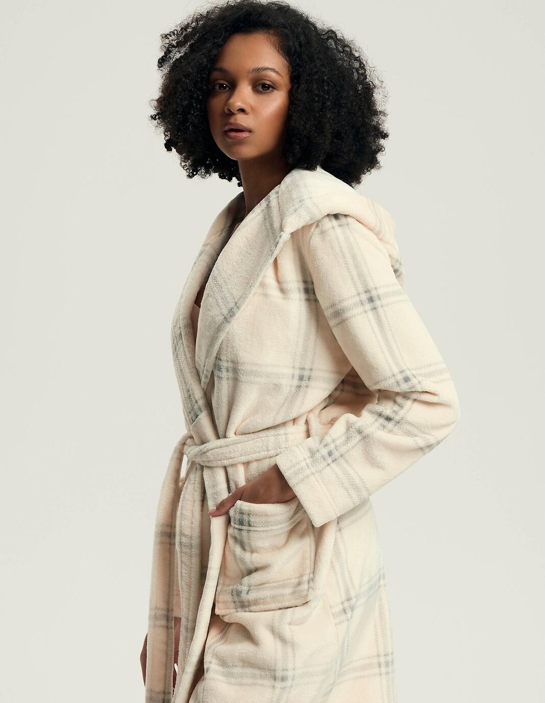 Dámský župan s kapucí - měkký, teplý úplet - kostkovaný vzor - dlouhé rukávy - zavazování v pase, s kapsami Složení: 100% polyester
