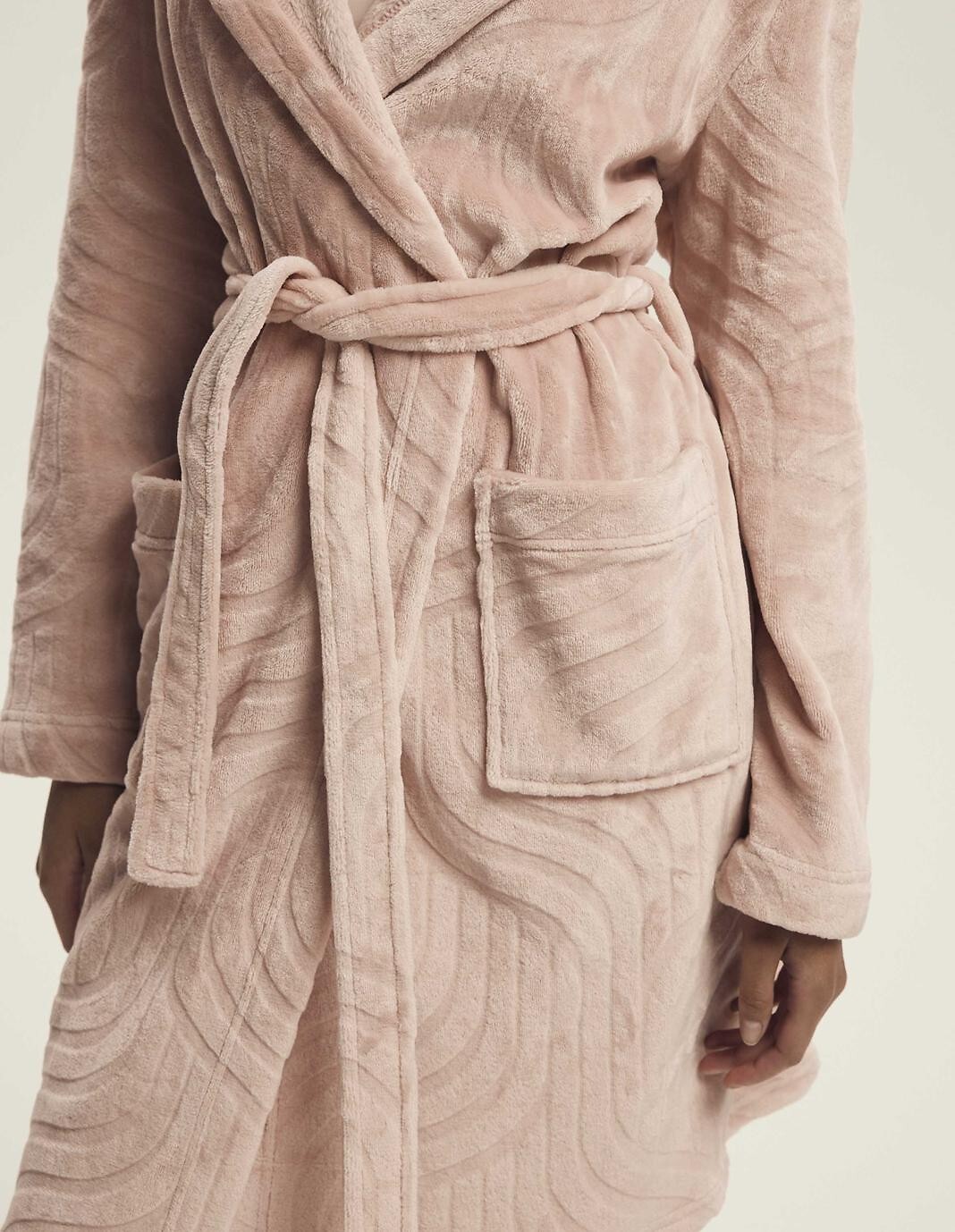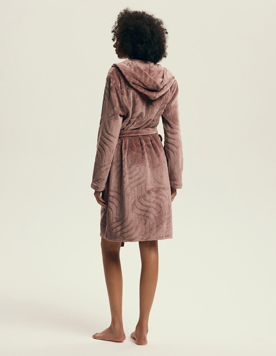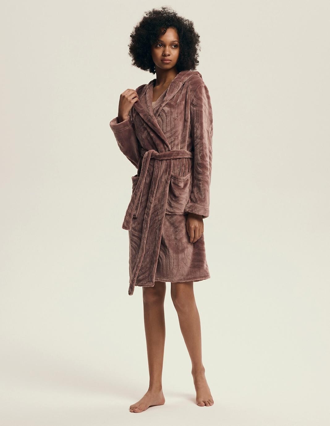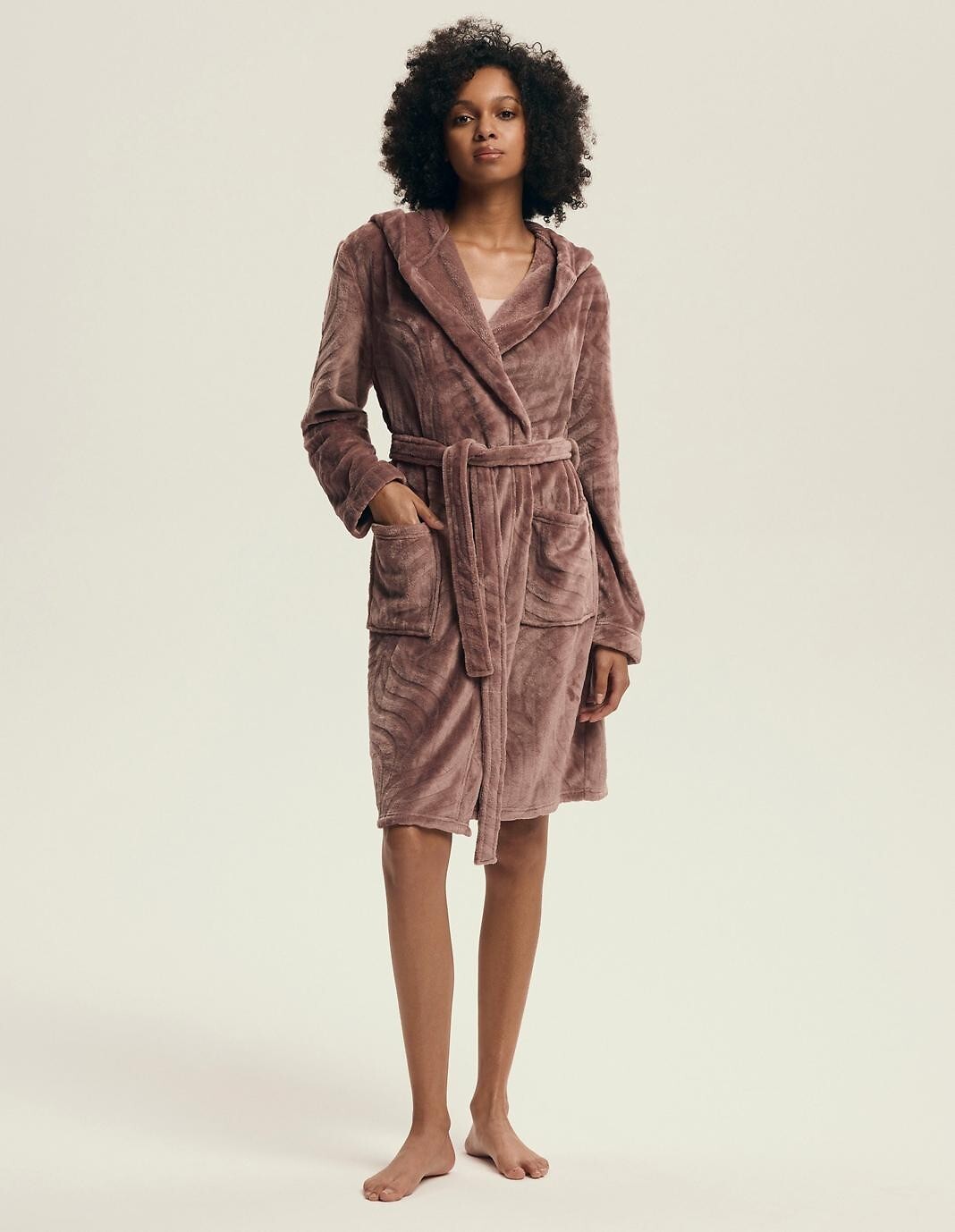 Krátký dámský župan s kapucí - měkký, teplý úplet - geometrický, reliéfní vzor - dlouhé rukávy - zavazování v pase, s kapsami Složení: 100% polyester