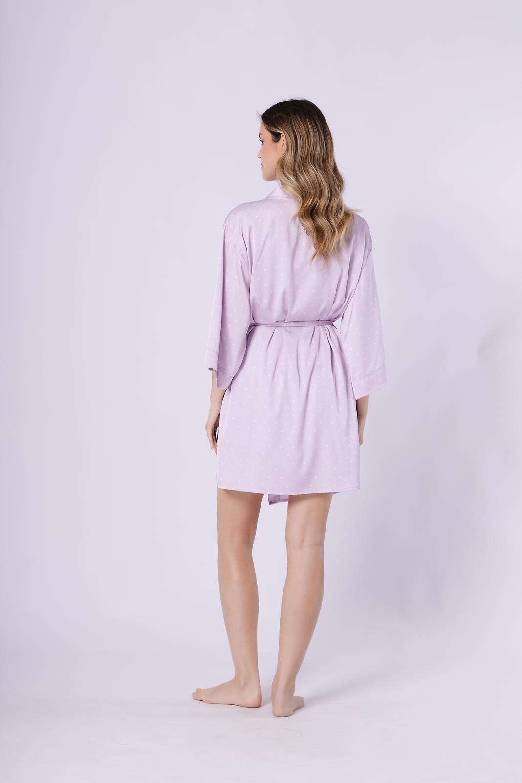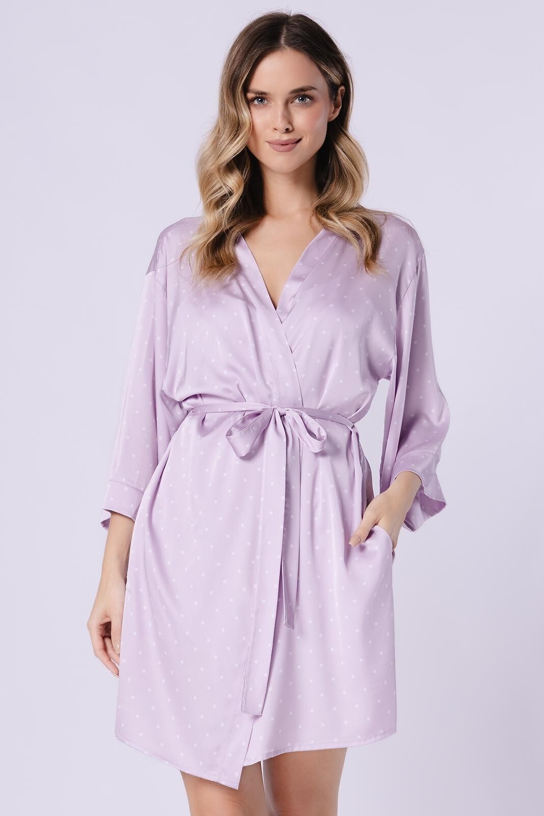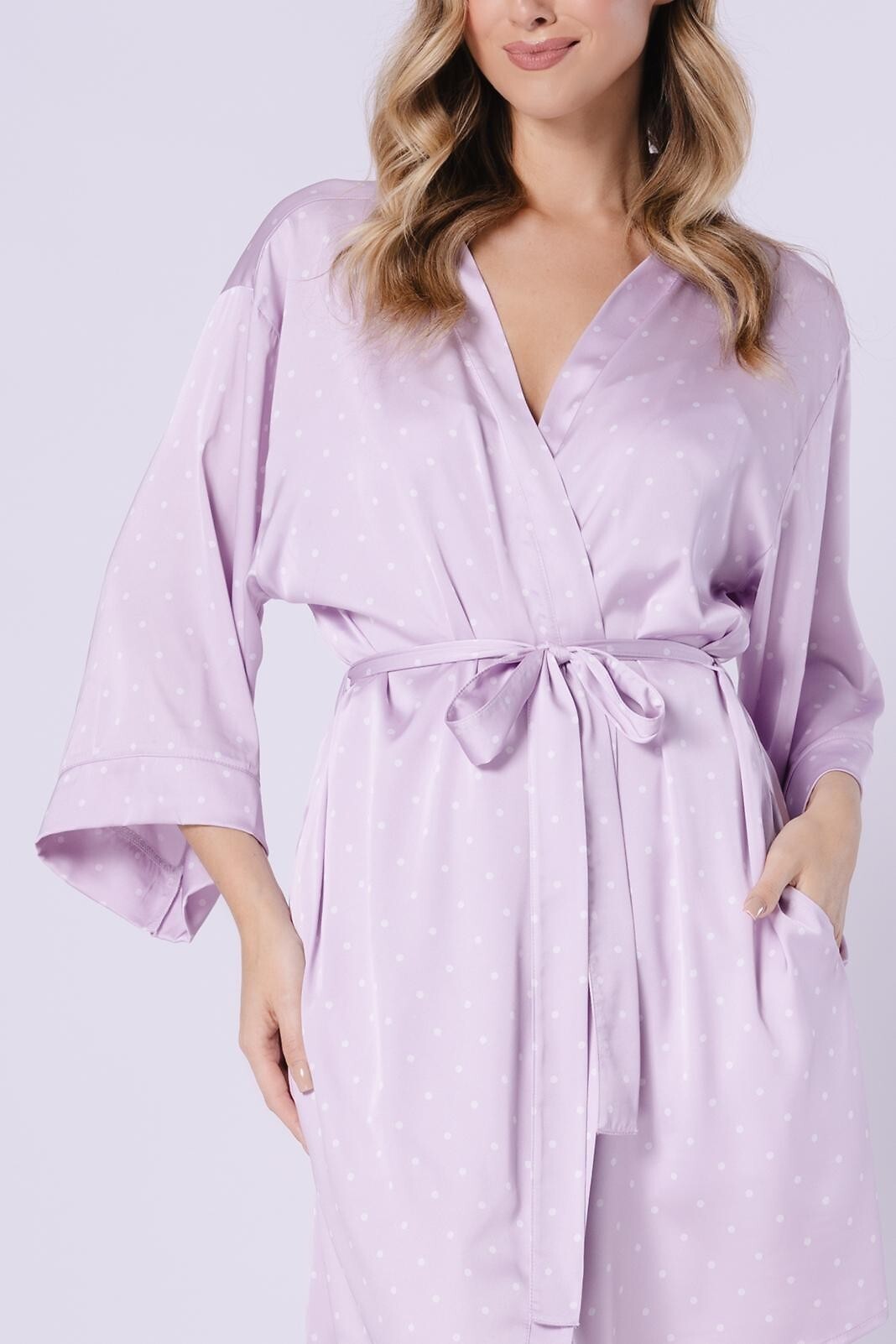 Dámský krátký župan - jemný satén s malými puntíky - volné 3/4 rukávy - zavazování v pase - pohodlné kapsy na bocích - délka nad kolena Složení: 100% polyester