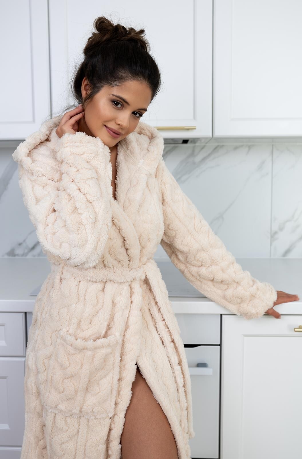 Dámský župan s kapucí - měkký úplet s reliéfním vzorem copánků - dlouhé rukávy - zavazování v pase - dvě vnější kapsy - délka po lýtka Složení: 100% polyester