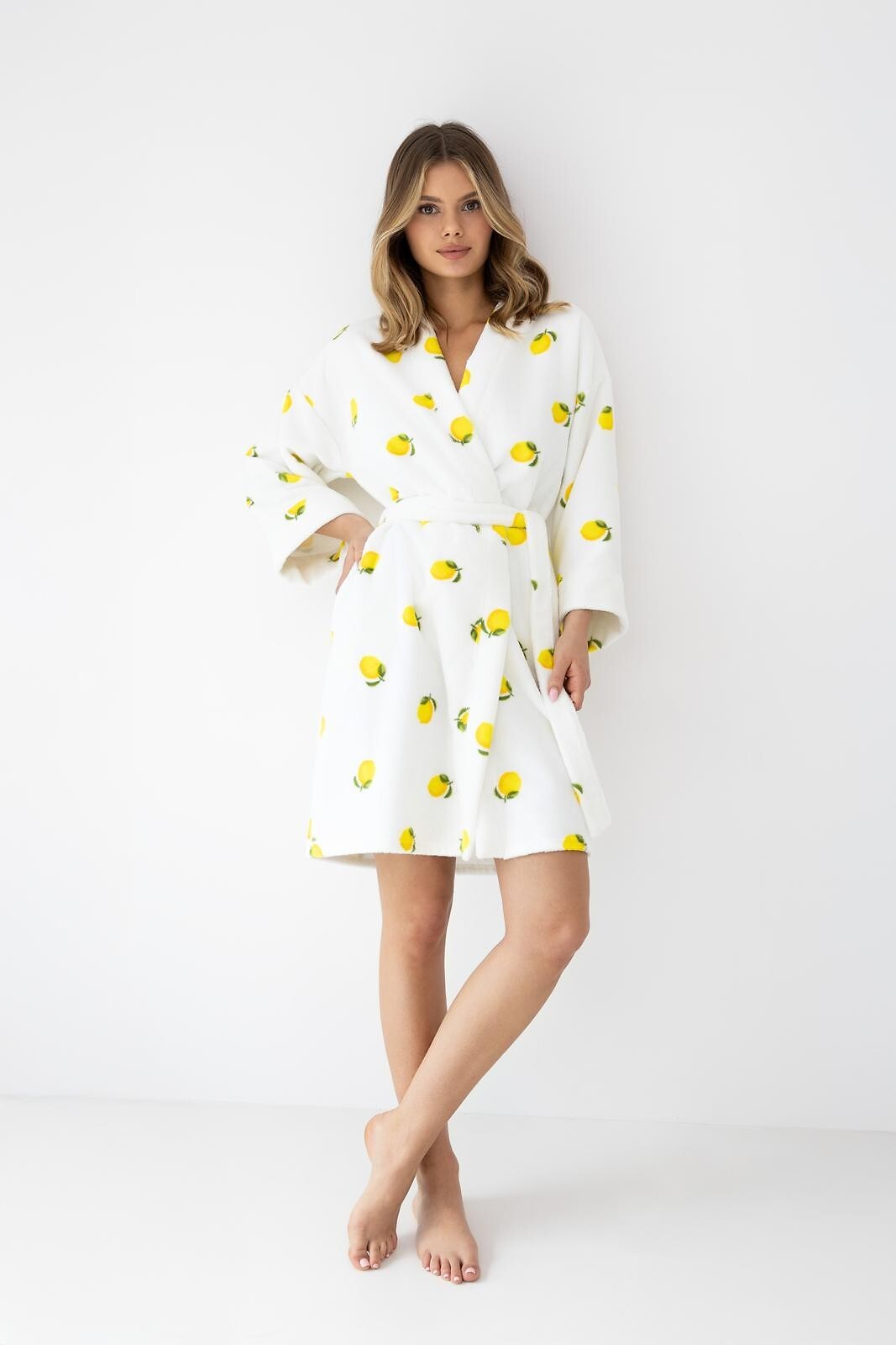 Krátký dámský župan - příjemná, měkká látka - citronový potisk - kimono límec - 7/8 rukávy - zavazování v pase - pohodlné kapsy na bocích - baleno v plastovém sáčku Složení: 55% bavlna, 45% polyester