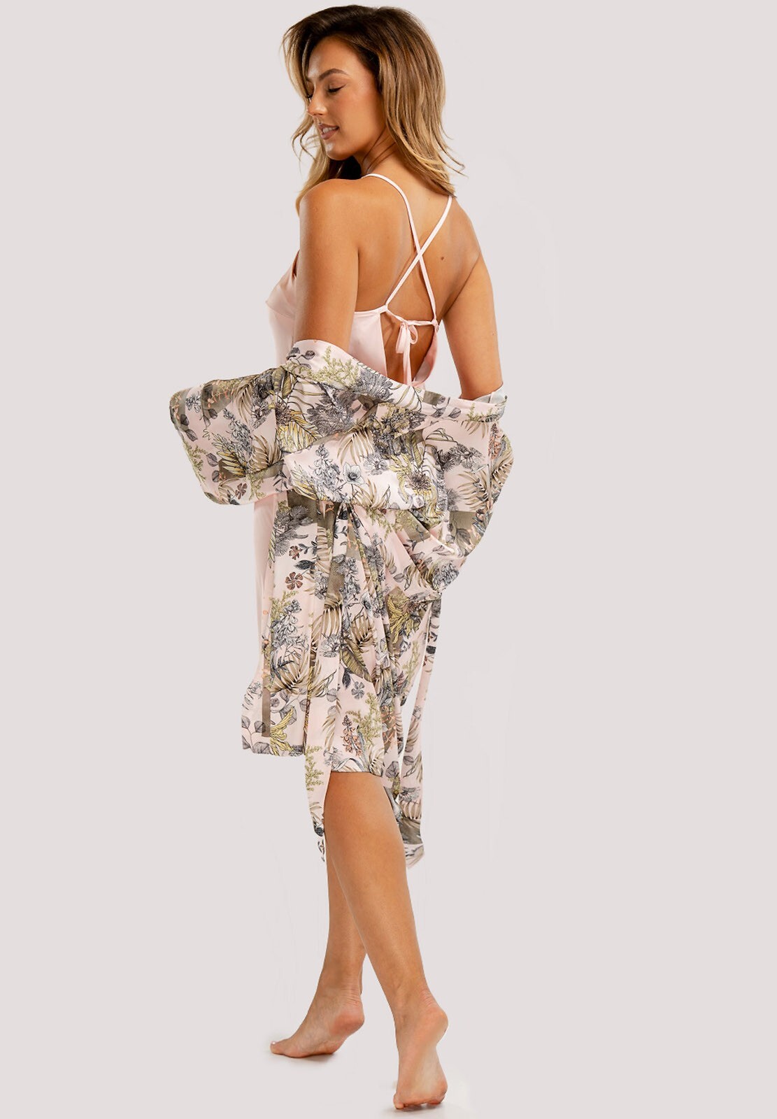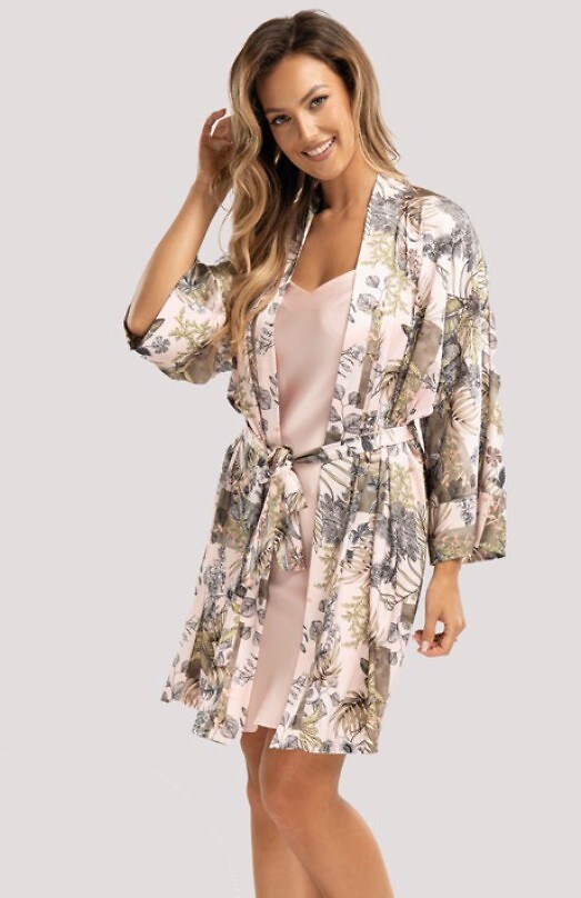 Dámský krátký župan - jemný satén - poutavý rostlinný potisk - volné rukávy - v pase se zavazuje páskem Složení: 100% polyester